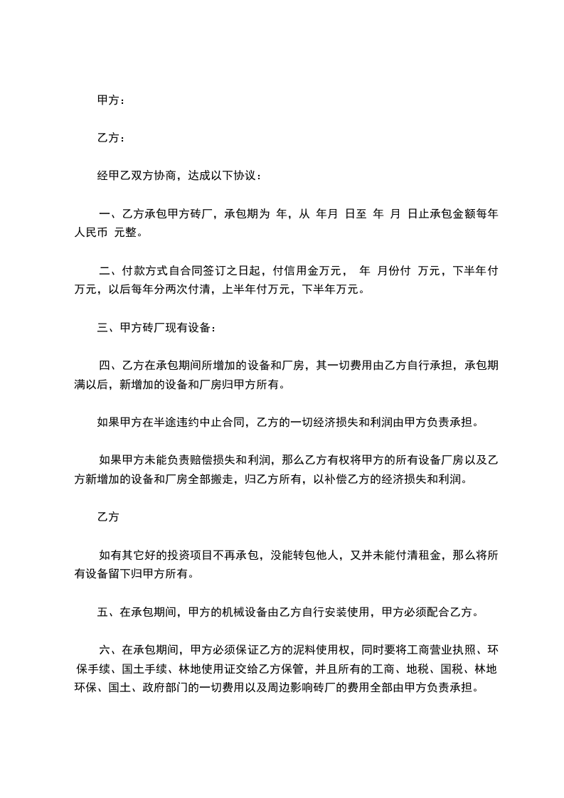 一、乙方承包甲方砖厂,承包期为 年,从 年月 日至 年 月 日止承包金额每年人民币 元整。