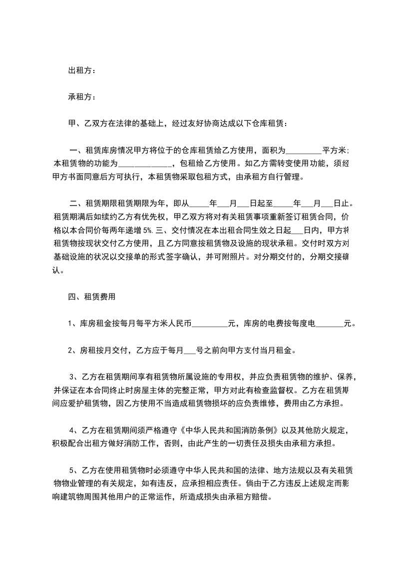 一、租赁库房情况甲方将位于的仓库租赁给乙方使用,面积为_________平方米;本租赁物的功能为_____________,包租给乙方使用。如乙方需转变使用功能,须经甲方书面同意后方可执行,本租赁物采取包租方式,由承租方自行管理。