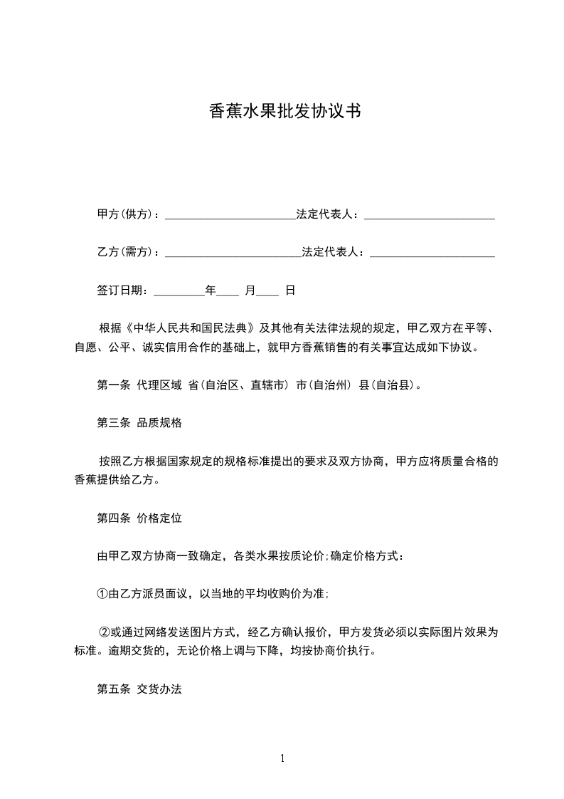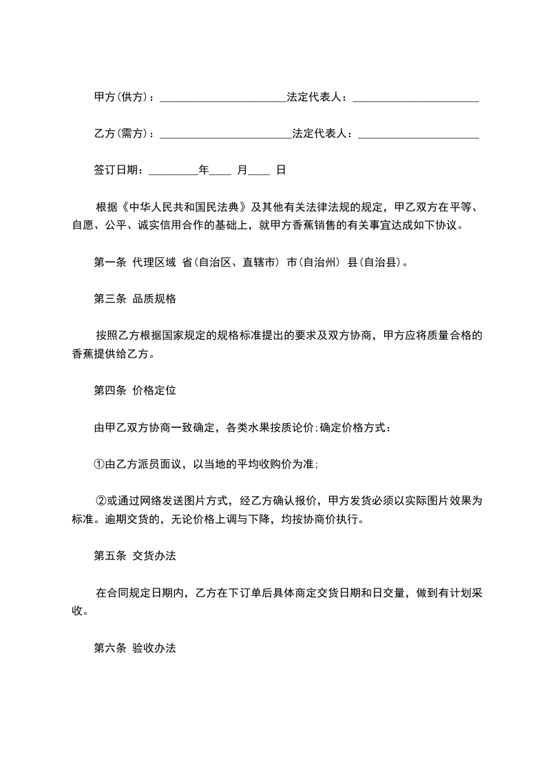 根据《中华人民共和国民法典》及其他有关法律法规的规定,甲乙双方在平等、自愿、公平、诚实信用合作的基础上,就甲方香蕉销售的有关事宜达成如下协议。