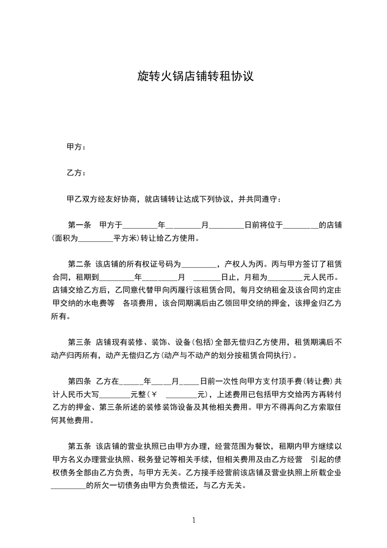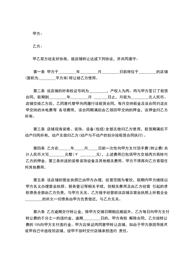 第一条 甲方于_________年_________月_________日前将位于_________的店铺(面积为_________平方米)转让给乙方使用。