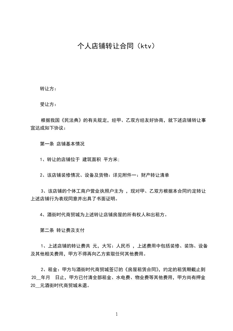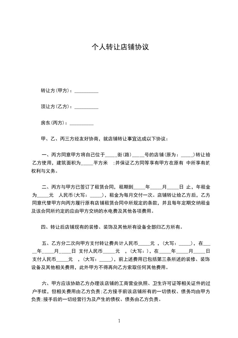 1、上述店铺的转让费共 元,大写:人民币 ,上述费用中包括装修、装饰、设备及其他相关费用,甲方不得再向乙方索取任何其他费用。