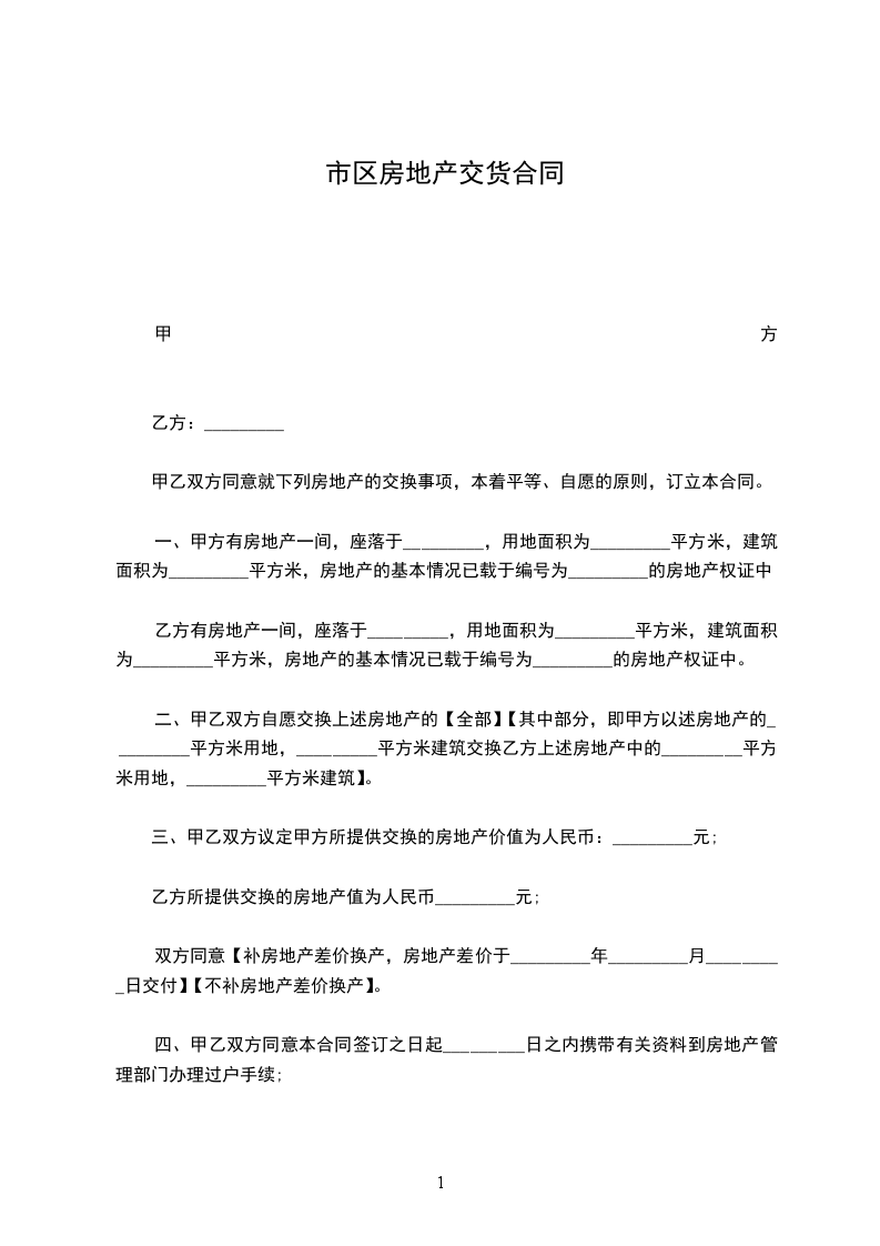 二、甲乙双方自愿交换上述房地产的【全部】【其中部分,即甲方以述房地产的_________平方米用地,_________平方米建筑交换乙方上述房地产中的_________平方米用地,_________平方米建筑】。