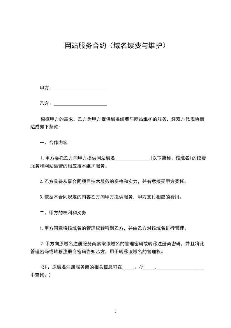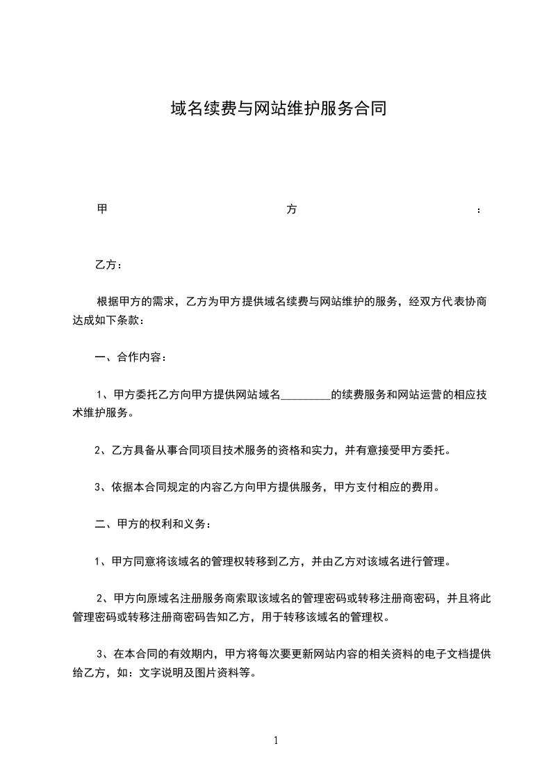 根据甲方的需求,乙方为甲方提供域名续费与网站维护的服务,经双方代表协商达成如下条款:
