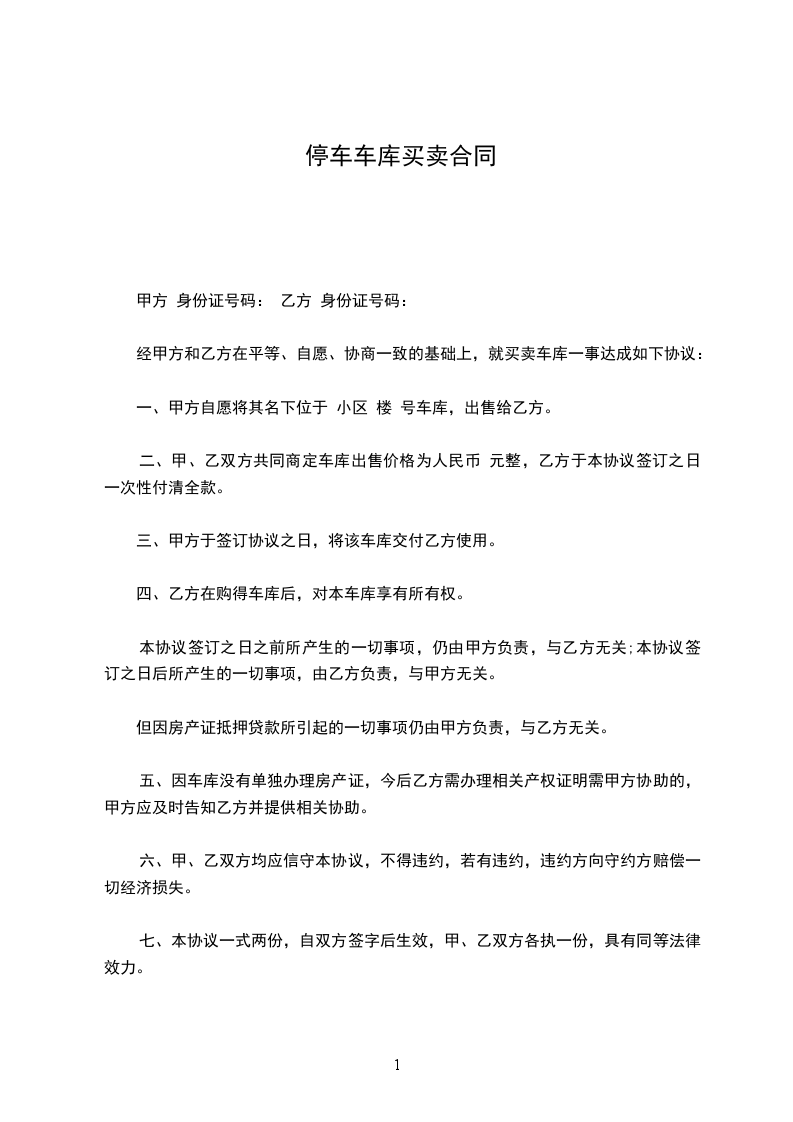 二、甲、乙双方共同商定车库出售价格为人民币 元整,乙方于本协议签订之日一次性付清全款。