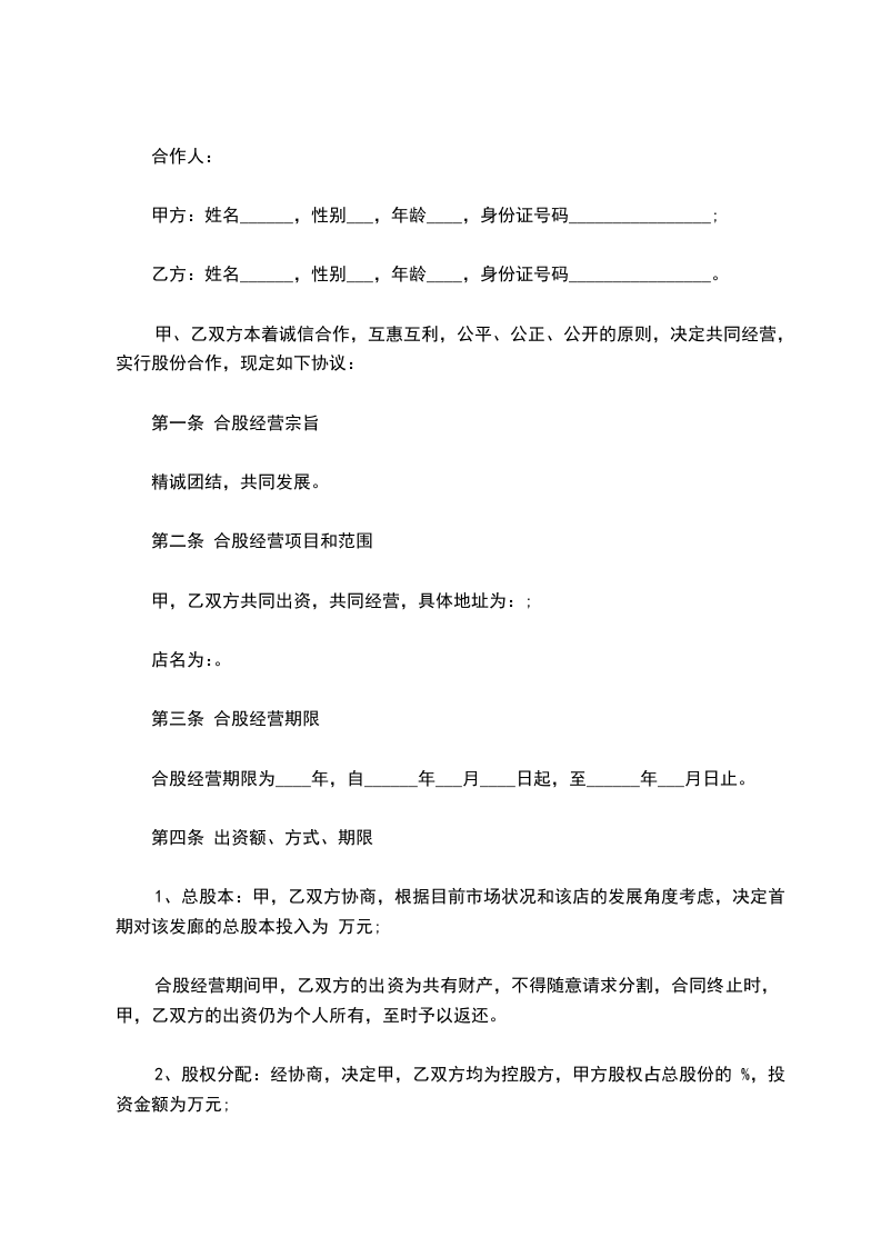 甲、乙双方本着诚信合作,互惠互利,公平、公正、公开的原则,决定共同经营,实行股份合作,现定如下协议: