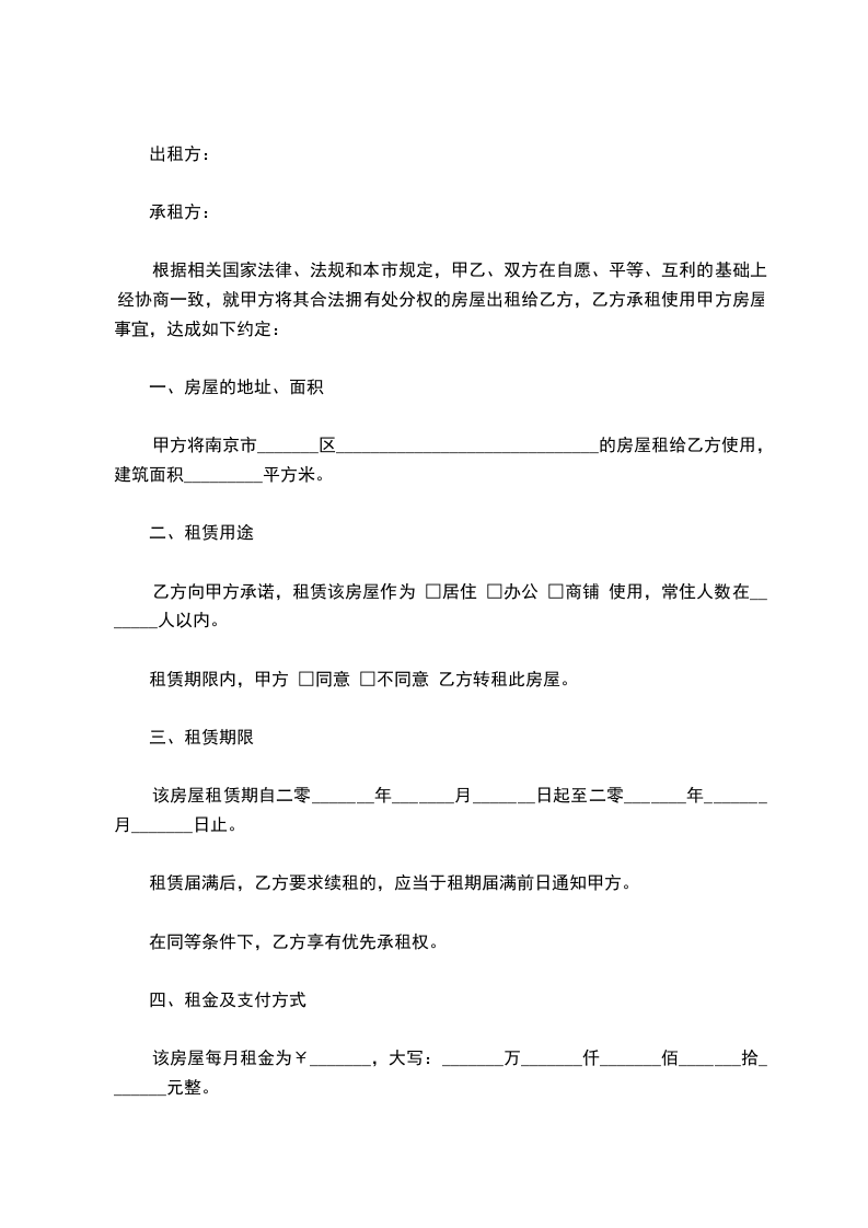 甲方将南京市_______区______________________________的房屋租给乙方使用,建筑面积_________平方米。