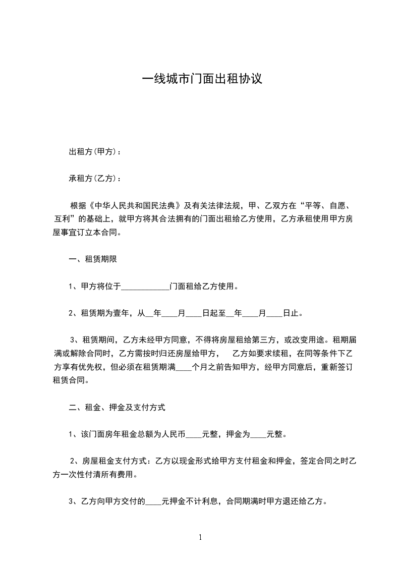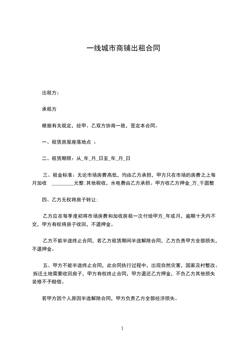(5)租赁期间,非本合同规定的情况,乙方中途擅自退租的,乙方应按提前退租天数的租金的________倍向甲方支付违约金。若违约金不足抵付甲方损失的,乙方还应负责赔偿。甲方可从租赁保证金中抵扣。保证金不足抵扣的,不足部分则由乙方另行支付。