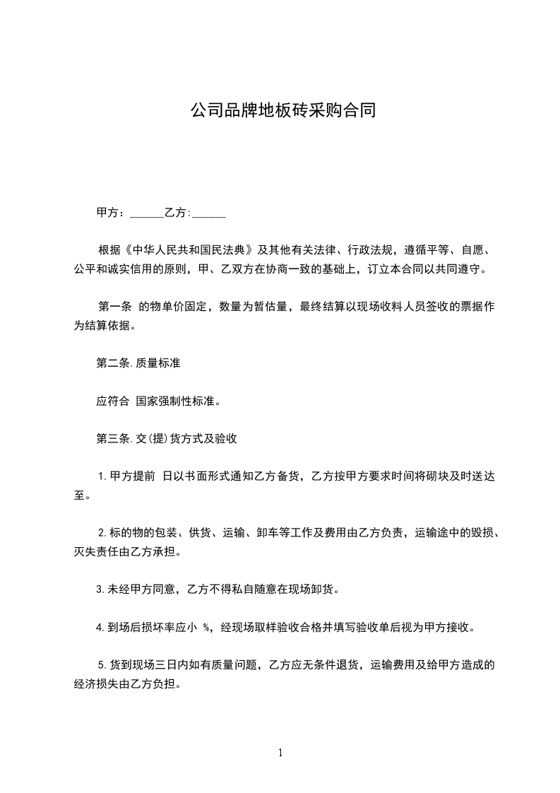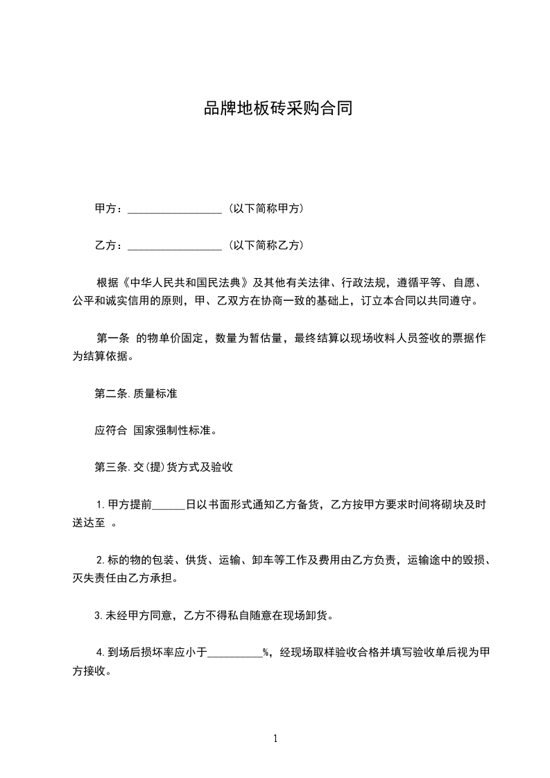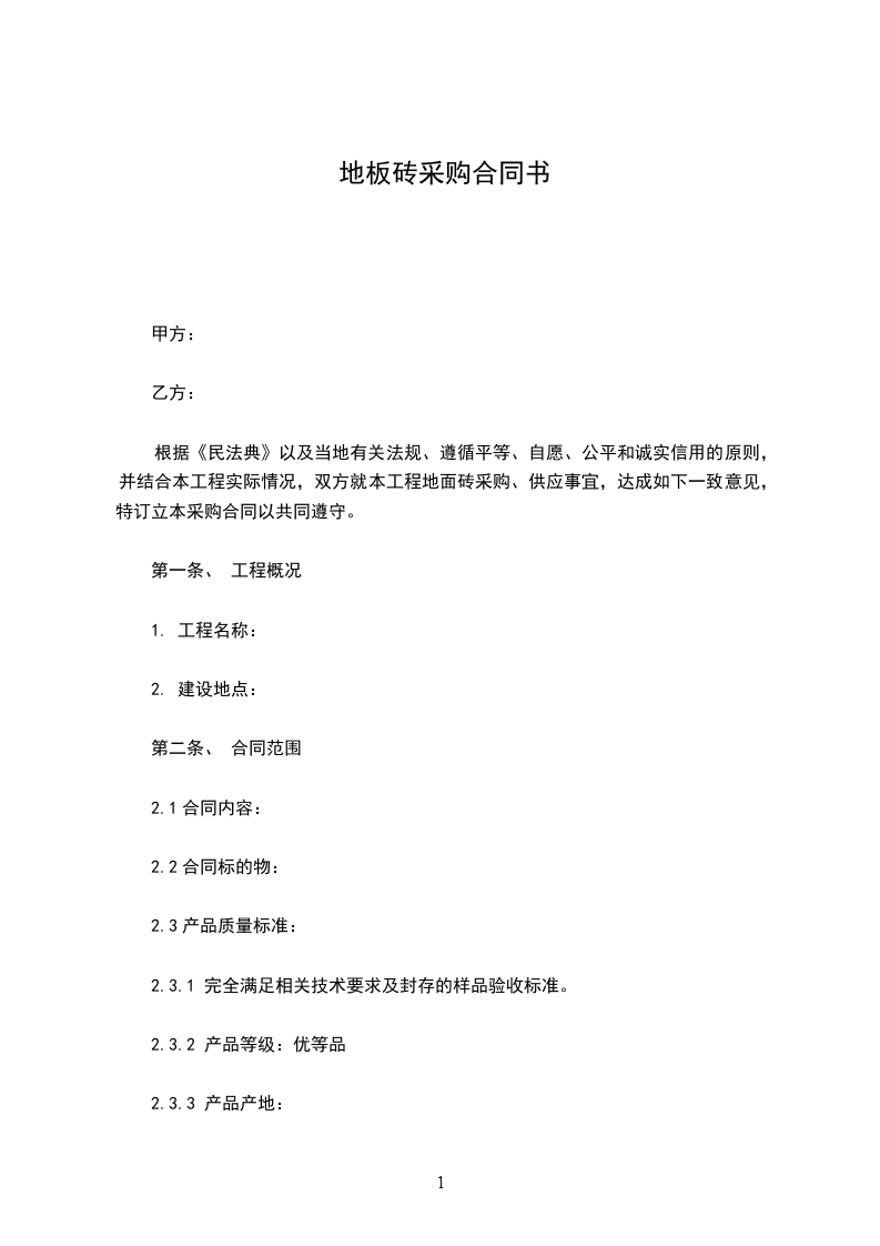 根据《民法典》以及当地有关法规、遵循平等、自愿、公平和诚实信用的原则,并结合本工程实际情况,双方就本工程地面砖采购、供应事宜,达成如下一致意见,特订立本采购合同以共同遵守。