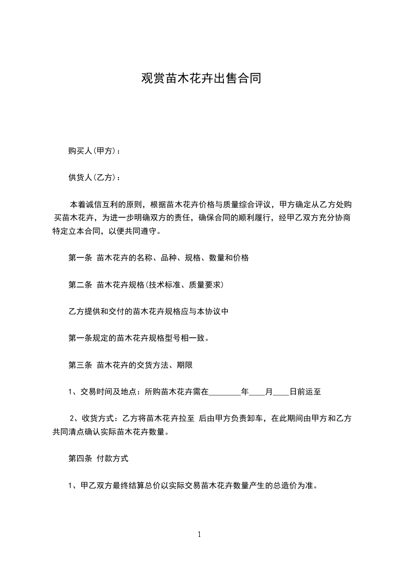 本着诚信互利的原则,根据苗木花卉价格与质量综合评议,甲方确定从乙方处购买苗木花卉,为进一步明确双方的责任,确保合同的顺利履行,经甲乙双方充分协商,特定立本合同,以便共同遵守。
