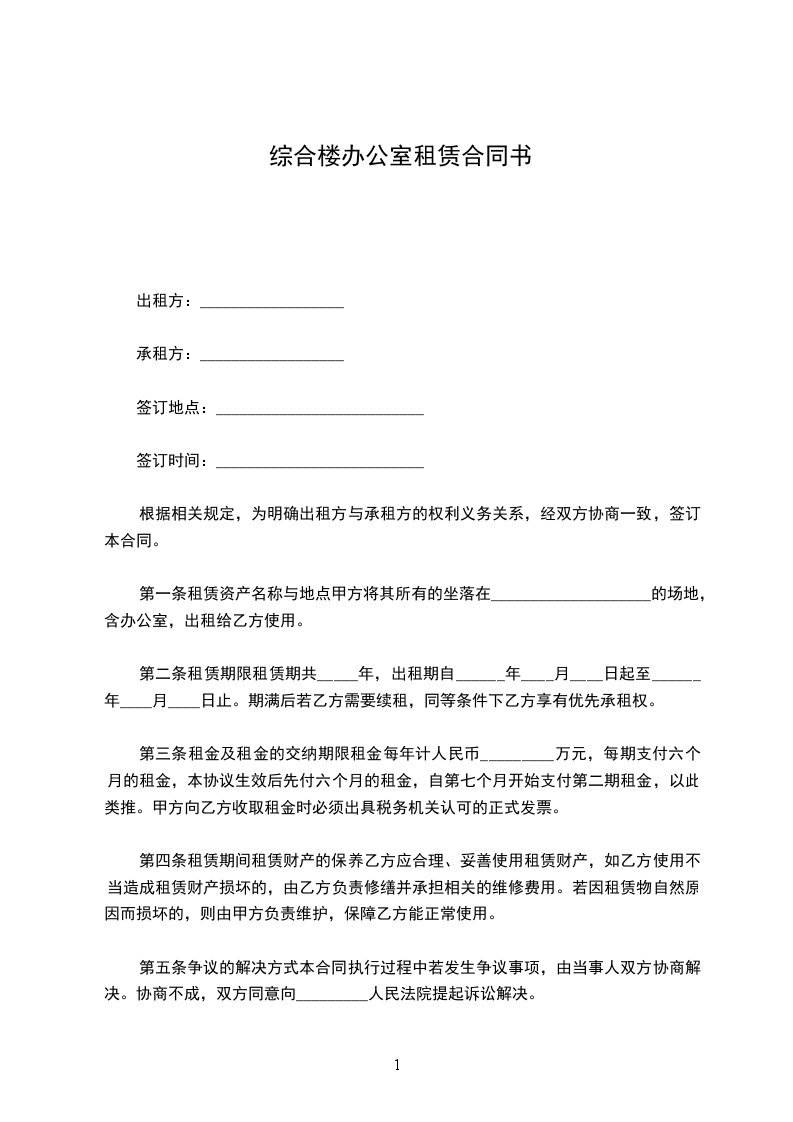 第一条租赁资产名称与地点甲方将其所有的坐落在____________________的场地,含办公室,出租给乙方使用。