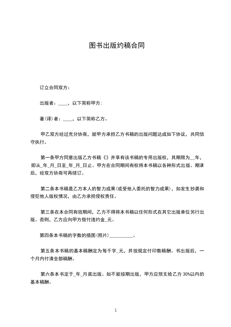 第一条甲方同意出版乙方书稿《》并享有该书稿的专用出版权,其期限为__年,即从_年_月_日至_年_月_日止。甲方在合同期间有权将本书稿以各种形式出版。期满后,经双方协商可再续订。