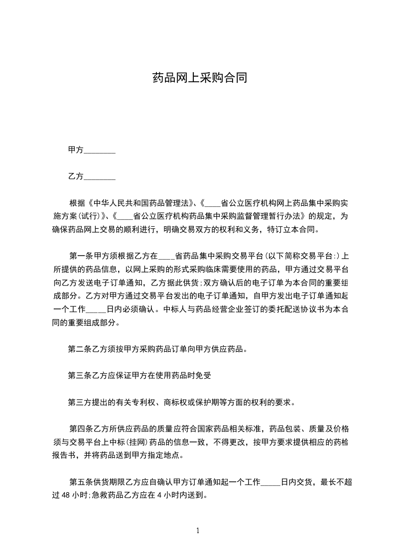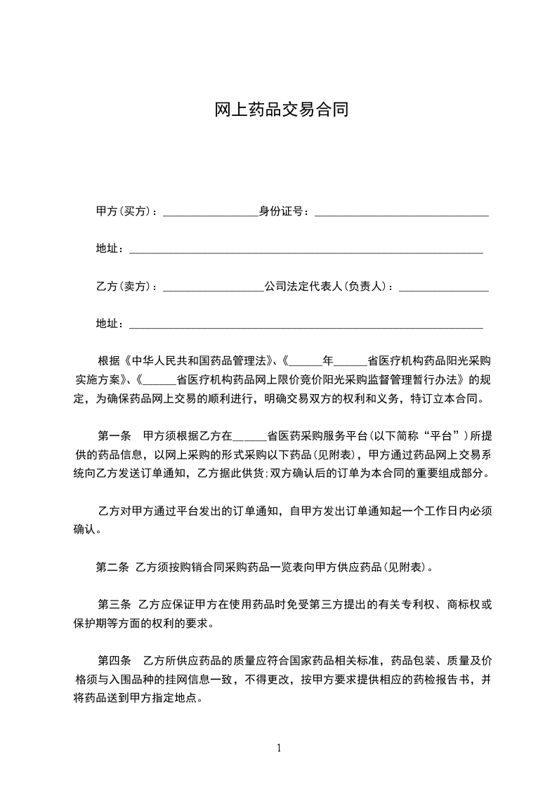 根据《中华人民共和国药品管理法》、《______年______省医疗机构药品阳光采购实施方案》、《______省医疗机构药品网上限价竞价阳光采购监督管理暂行办法》的规定,为确保药品网上交易的顺利进行,明确交易双方的权利和义务,特订立本合同。