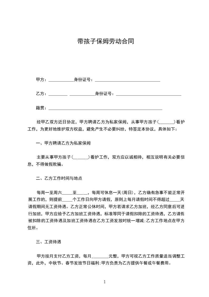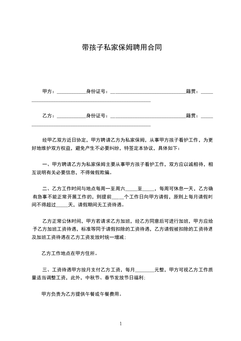 一、甲方聘请乙方为私家保姆主要从事甲方孩子看护工作,双方应以诚相待,相互说明有关必要信息,不得做假欺骗。