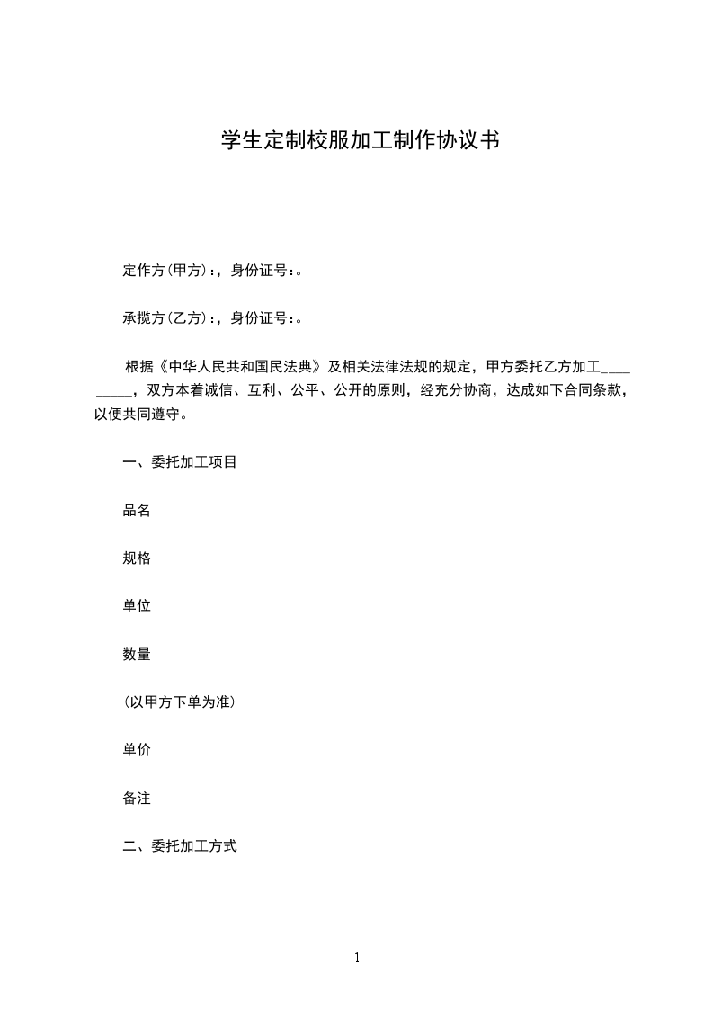 根据《中华人民共和国民法典》及相关法律法规的规定,甲方委托乙方加工_________,双方本着诚信、互利、公平、公开的原则,经充分协商,达成如下合同条款,以便共同遵守。