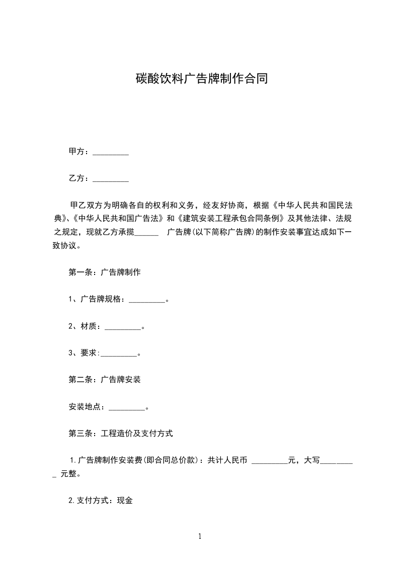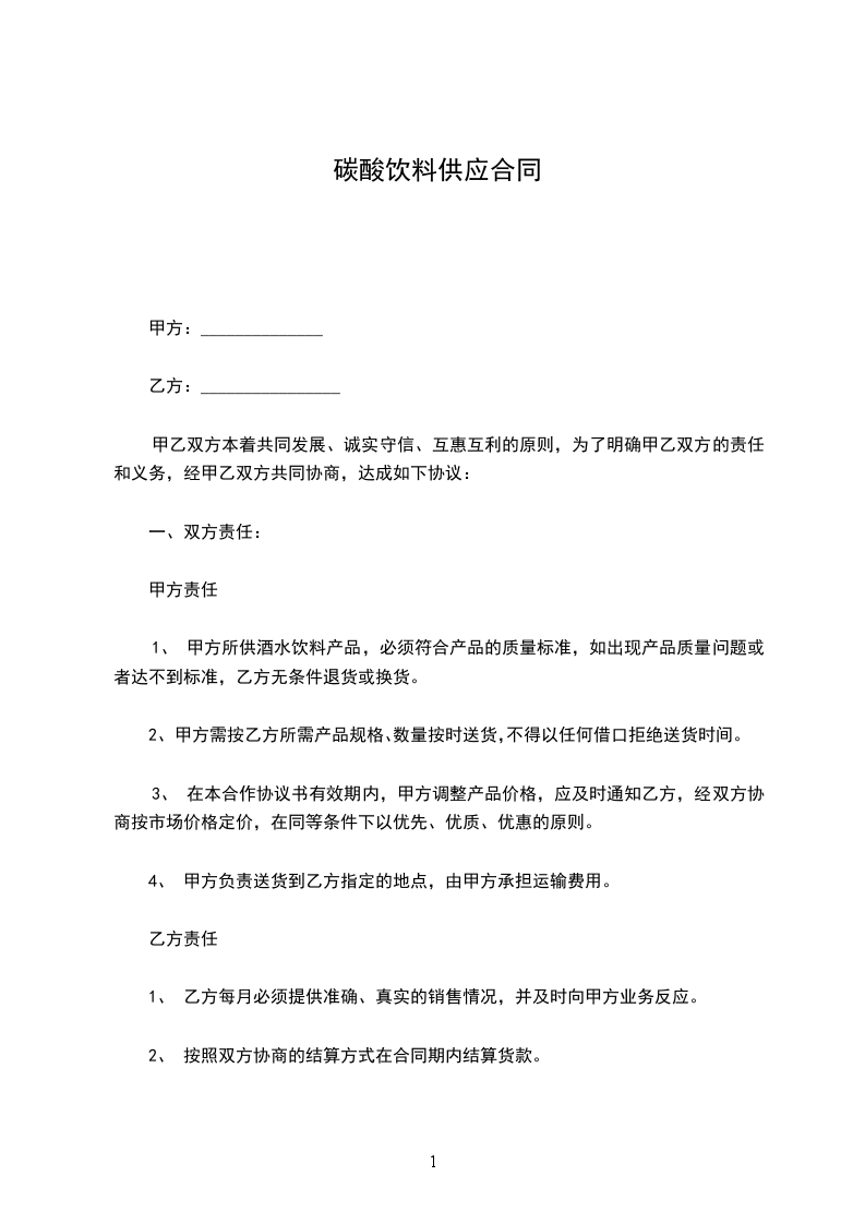 一、甲方指定乙方作为碳酸饮料系列产品的代理商。产品代理价格为_______元/件。