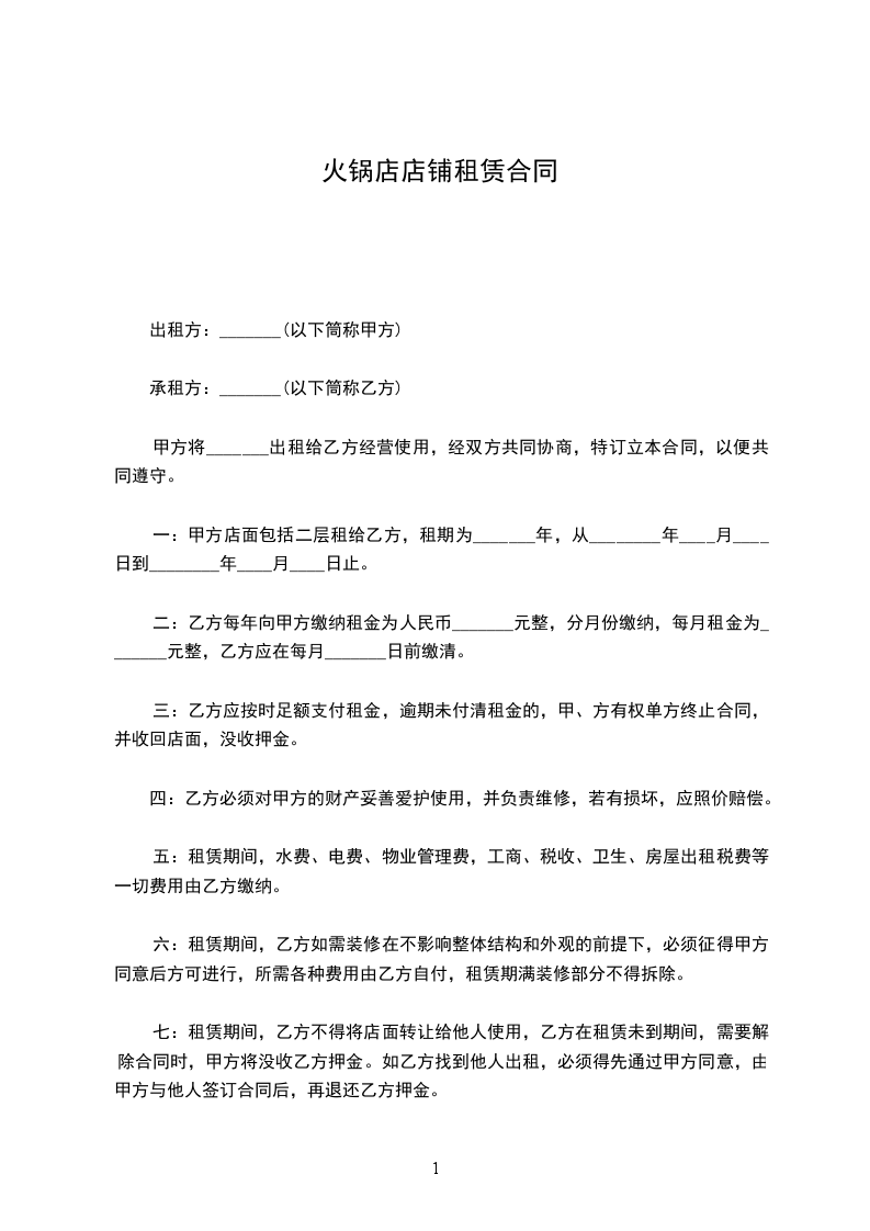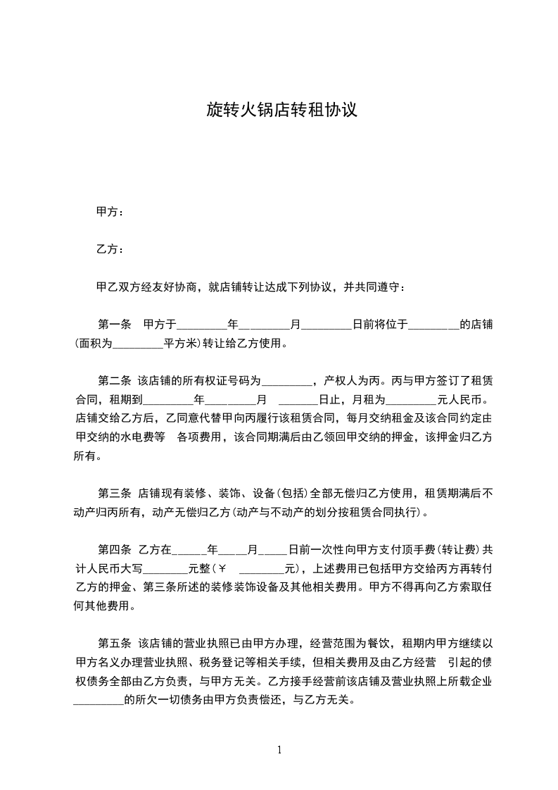 第一条 甲方于_________年_________月_________日前将位于_________的店铺(面积为_________平方米)转让给乙方使用。