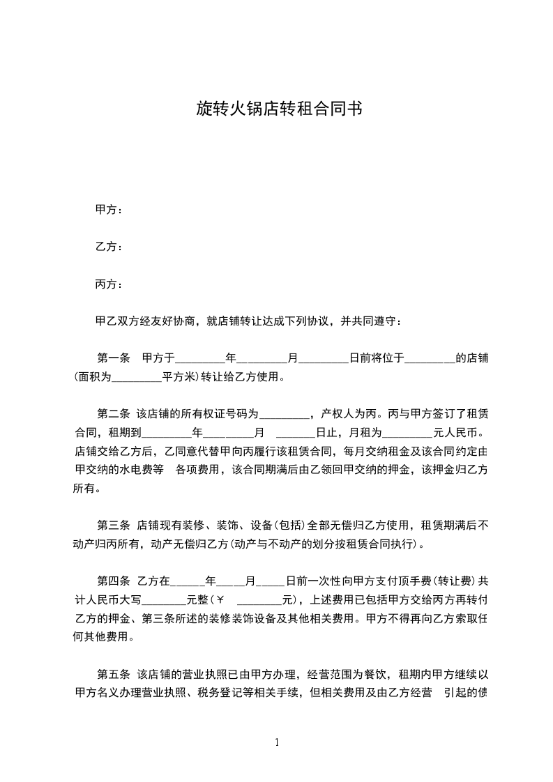 第二条 该店铺的所有权证号码为_________,产权人为丙。丙与甲方签订了租赁合同,租期到_________年_________月 _______日止,月租为_________元人民币。店铺交给乙方后,乙同意代替甲向丙履行该租赁合同,每月交纳租金及该合同约定由甲交纳的水电费等 各项费用,该合同期满后由乙领回甲交纳的押金,该押金归乙方所有。