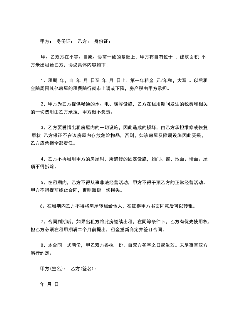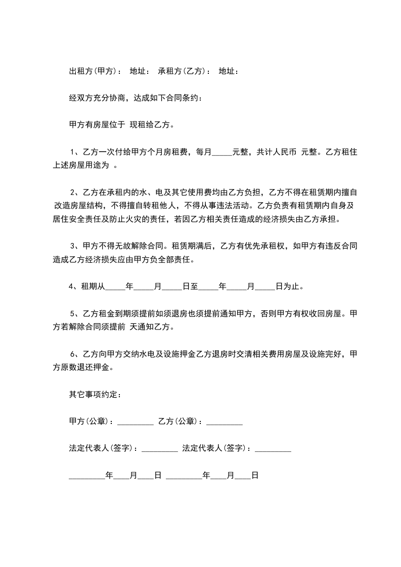 第二条:乙方租房时间从 月至 止,为期 个月,每月租金为 元,乙方应付一个月上期,一个月押金,水电费按实际使用结算,电每度 元,水每吨 元。押金待合同期满后退还给乙方,如乙方中途退房,不仅押金归甲方所有,而且乙方还要交清当月房租及水电等相关费用。在合同期满当月如确定退房或继租,需提前 天告知甲方,倘若不通知甲方,甲方有权扣除押金作为补偿损失,如不按期交租者,甲方有权断水、断电或更换门锁,重新对外出租,取消乙方租房合同。乙方退房前必须清理遗留下的物件,将本房屋打扫干净,如未打扫干净的扣30元作为打扫卫生费用。