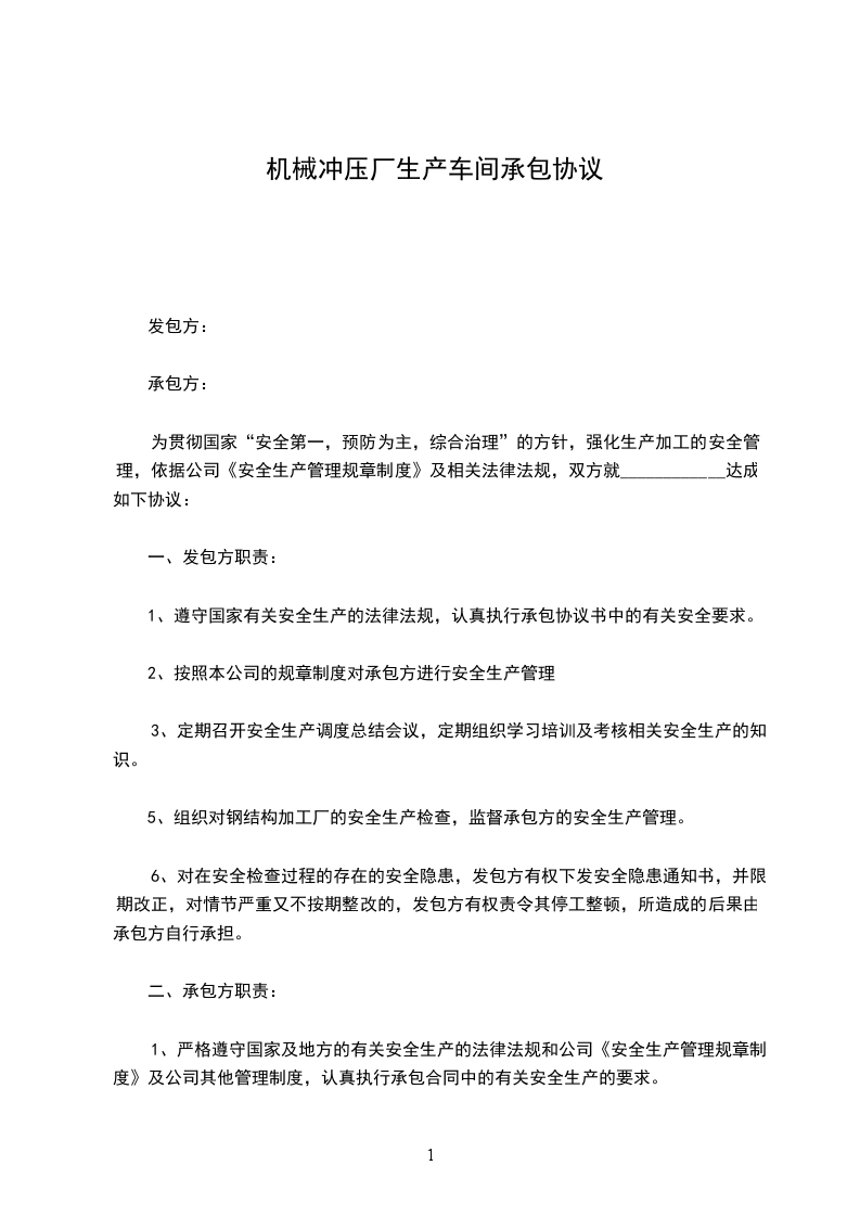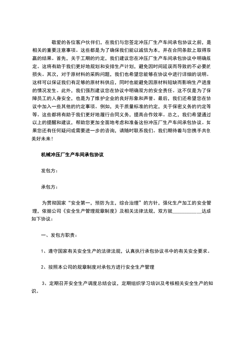 为贯彻国家“安全第一,预防为主,综合治理”的方针,强化生产加工的安全管理,依据公司《安全生产管理规章制度》及相关法律法规,双方就____________达成如下协议: