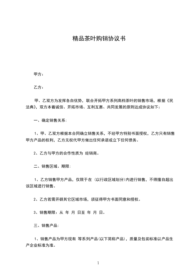 甲、乙双方为发挥各自优势,联合开拓甲方系列高档茶叶的销售市场,根据《民法典》,双方本着诚信、开拓市场、互利互惠、共同发展的原则达成协议如下: