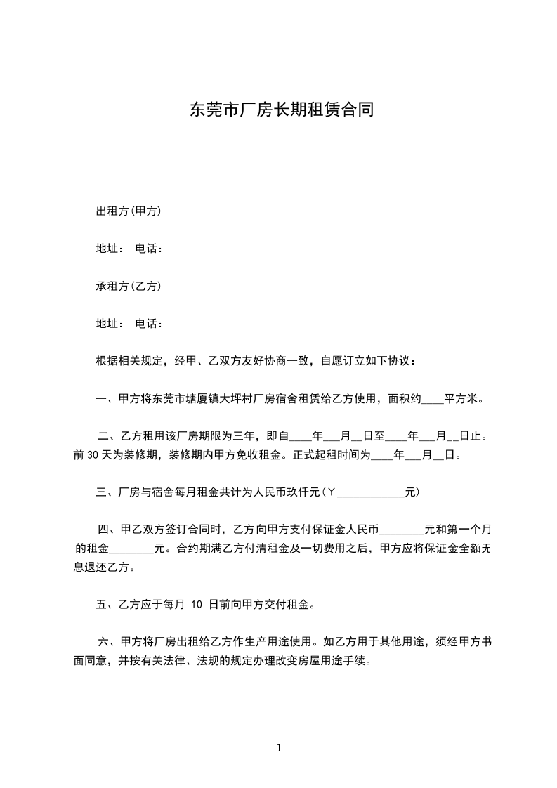 一、甲方将东莞市塘厦镇大坪村厂房宿舍租赁给乙方使用,面积约____平方米。
