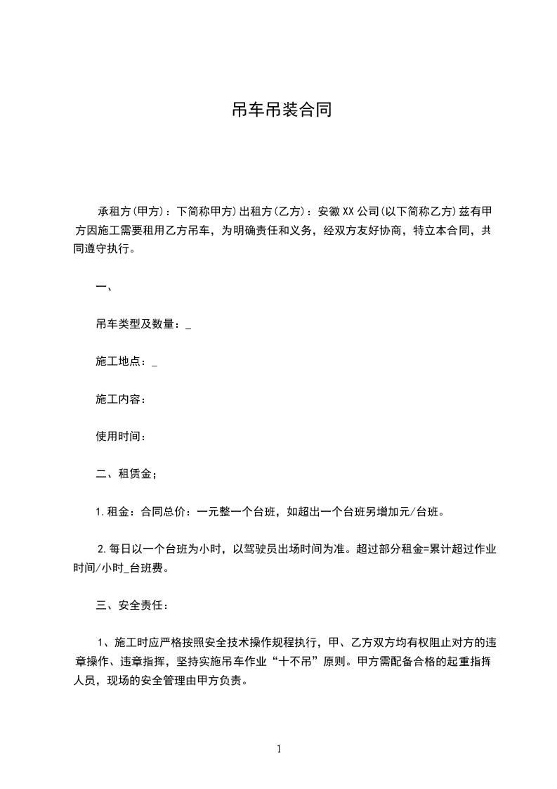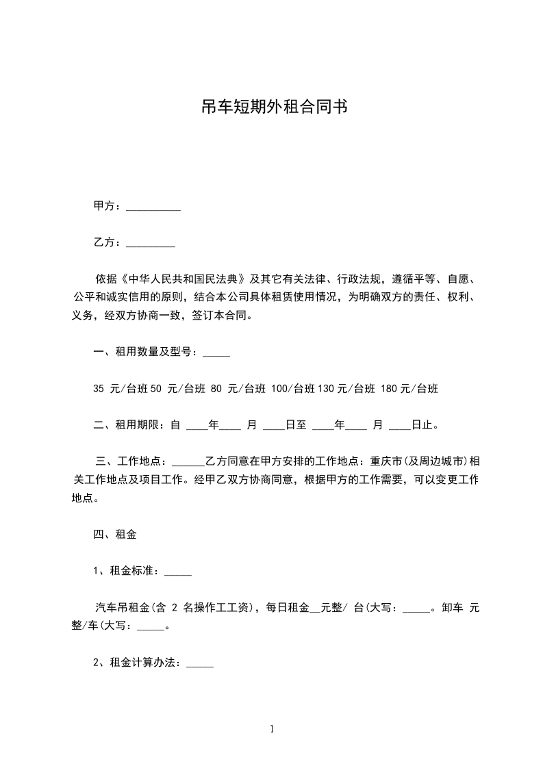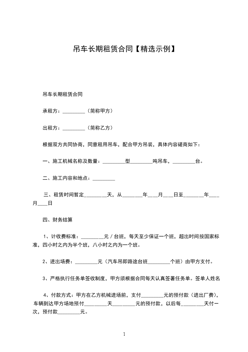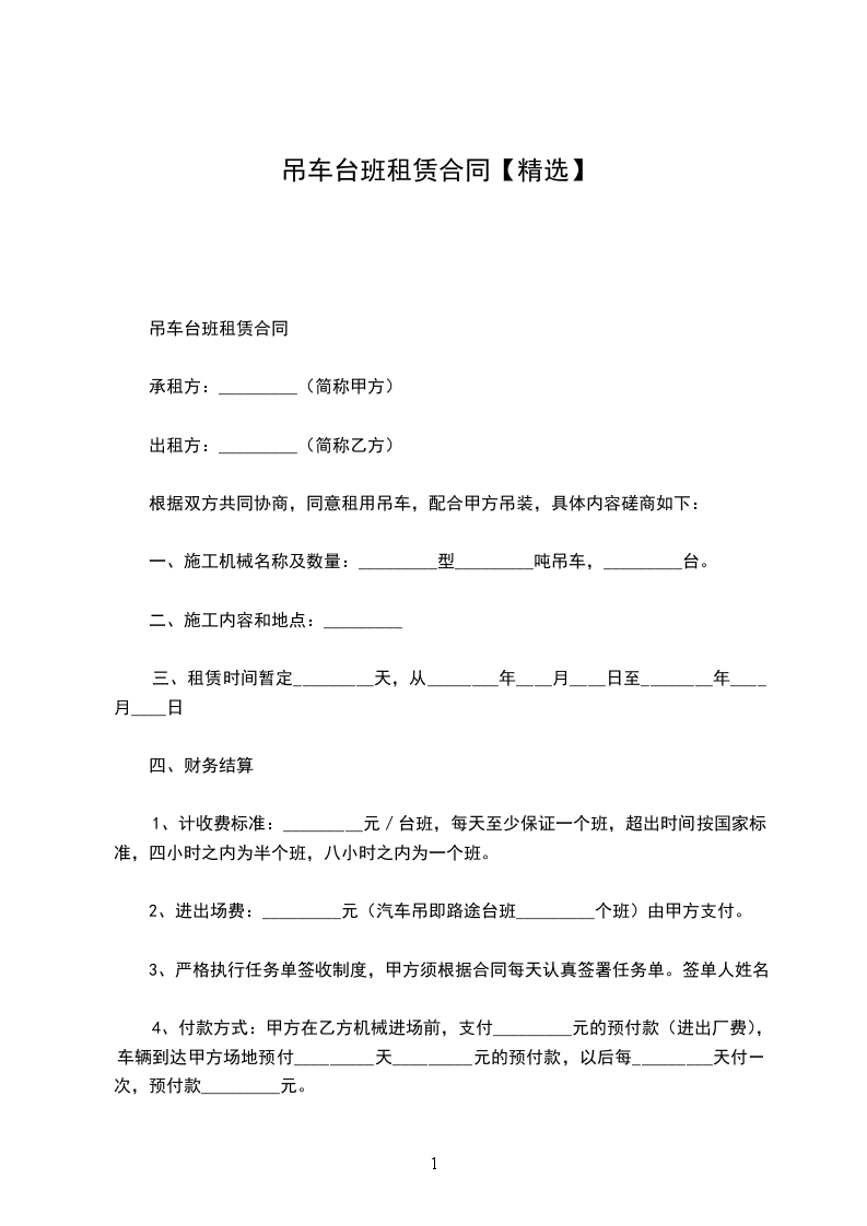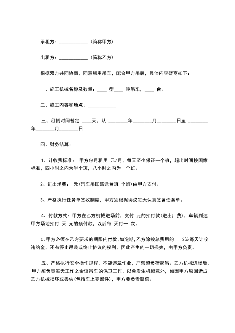 一、租赁时间从_____年_____月_____日算起,租赁费为每月_____元整(不开___)。租赁费最少按一个月计算。一个月后按实际天数结算,吊车进场预付伍仟元。