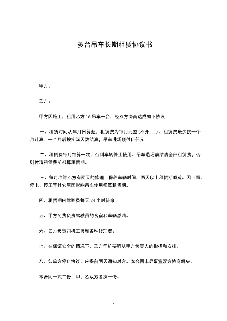甲方因施工,租用乙方16吊车一台,经双方协商达成如下协议: