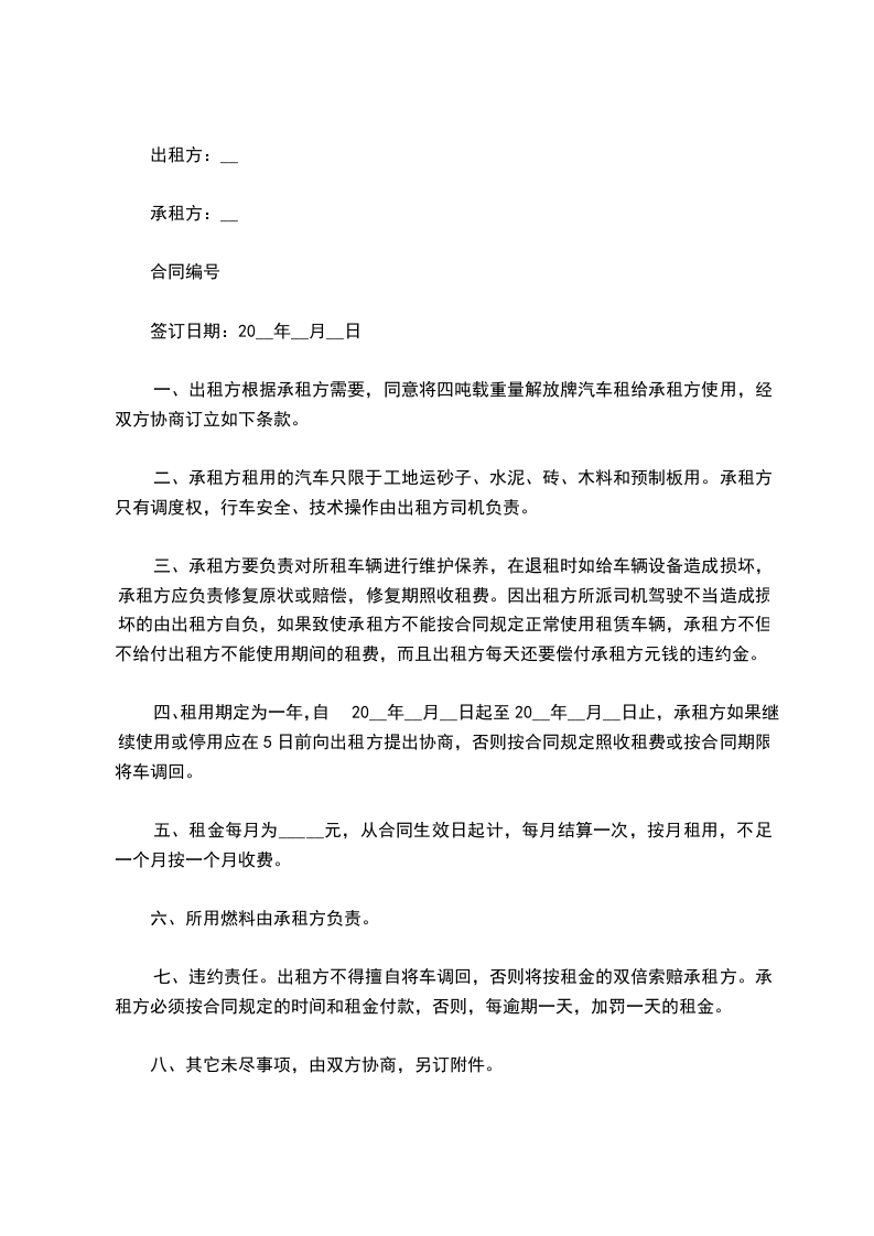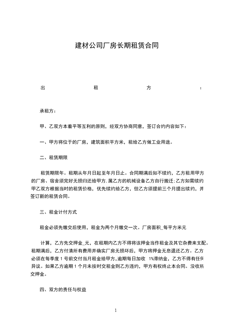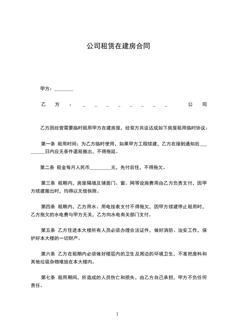 第一条 租用时间:为乙方临时使用,如果甲方工程续建,乙方在接到通知后_________日内应无条件退租搬出,不得拖延。