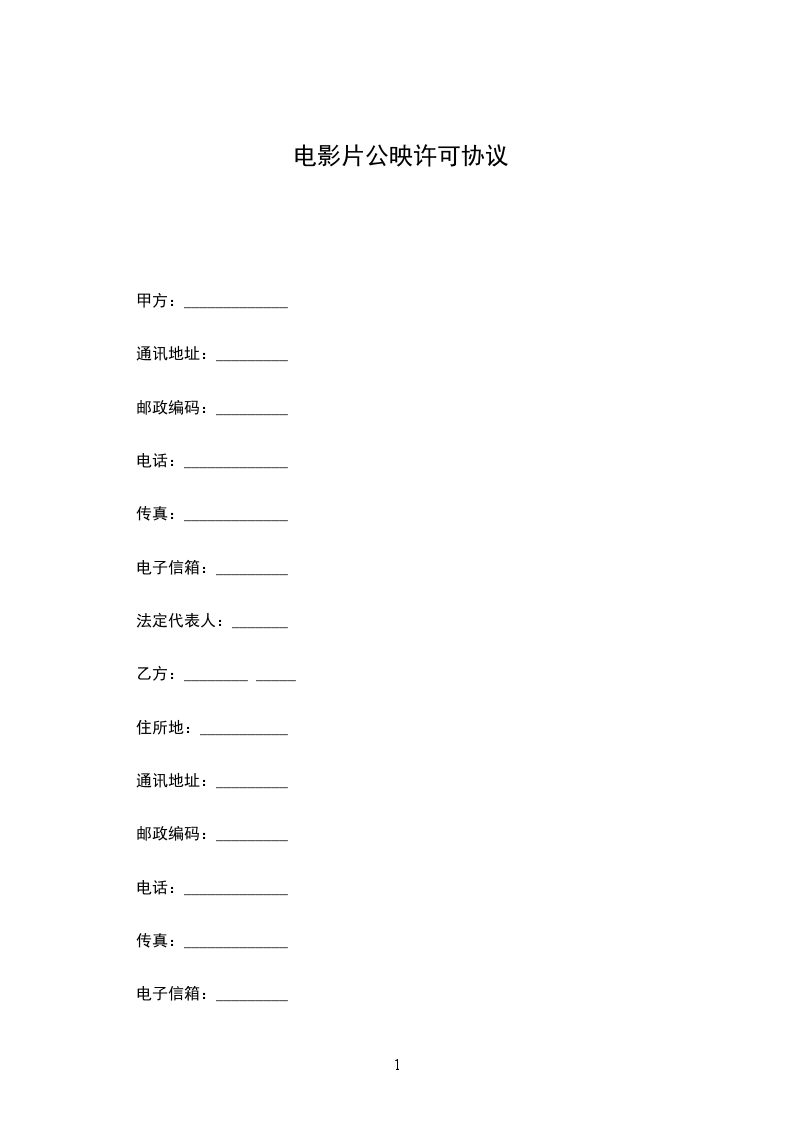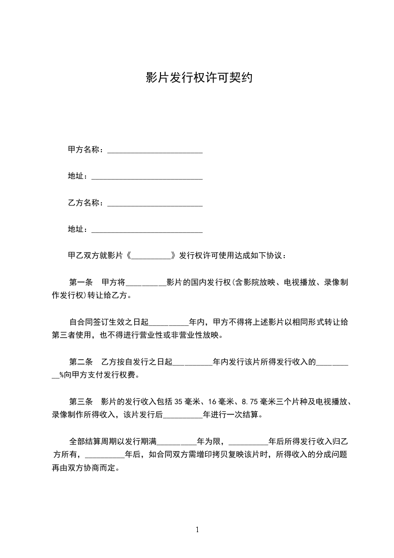 1. 甲方为___________(计划摄制/正在摄制)的电影片《____________________》(以下简称电影片)的著作权人,乙方为依法注册成立并合法取得电影片发行资格的法人单位;