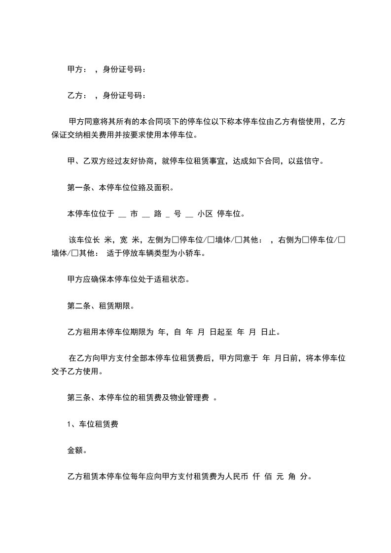 本停车位位于 市 路 号 小区(以下简称本小区) 停车位(车位号码以开发商排序为准)。 该车位长 米,宽 米,左侧为□停车位/□墙体/□其他: ,右侧为□停车位/□墙体/□其他: 适于停放车辆类型为小轿车。甲方应确保本停车位处于适租状态。