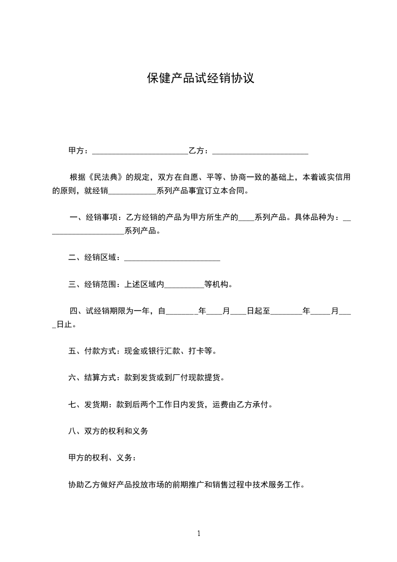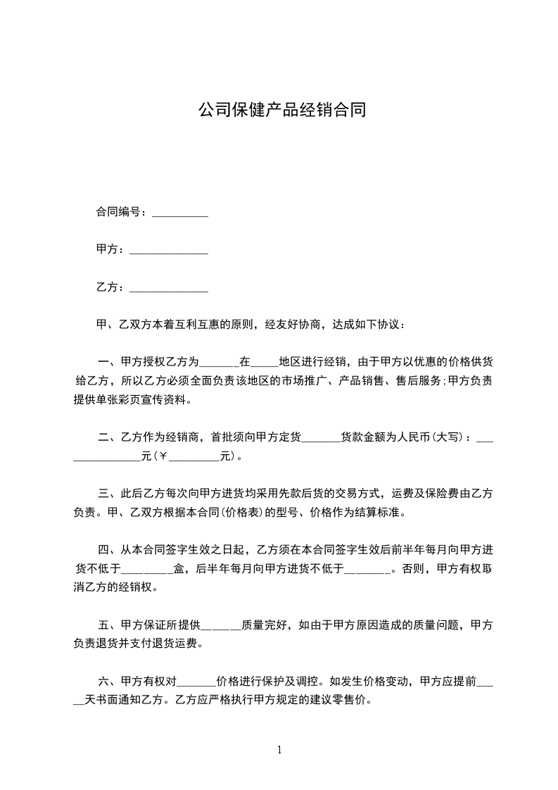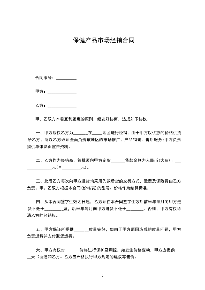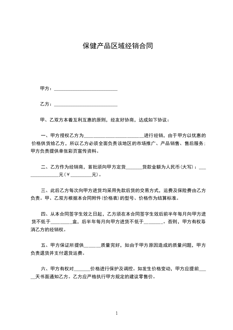2.销售范围:甲方指定乙方在_________省_________市_________区内销售甲方产品,但甲方保留在此区发展新客户的权利。