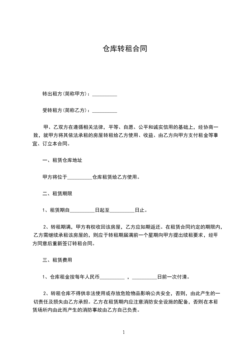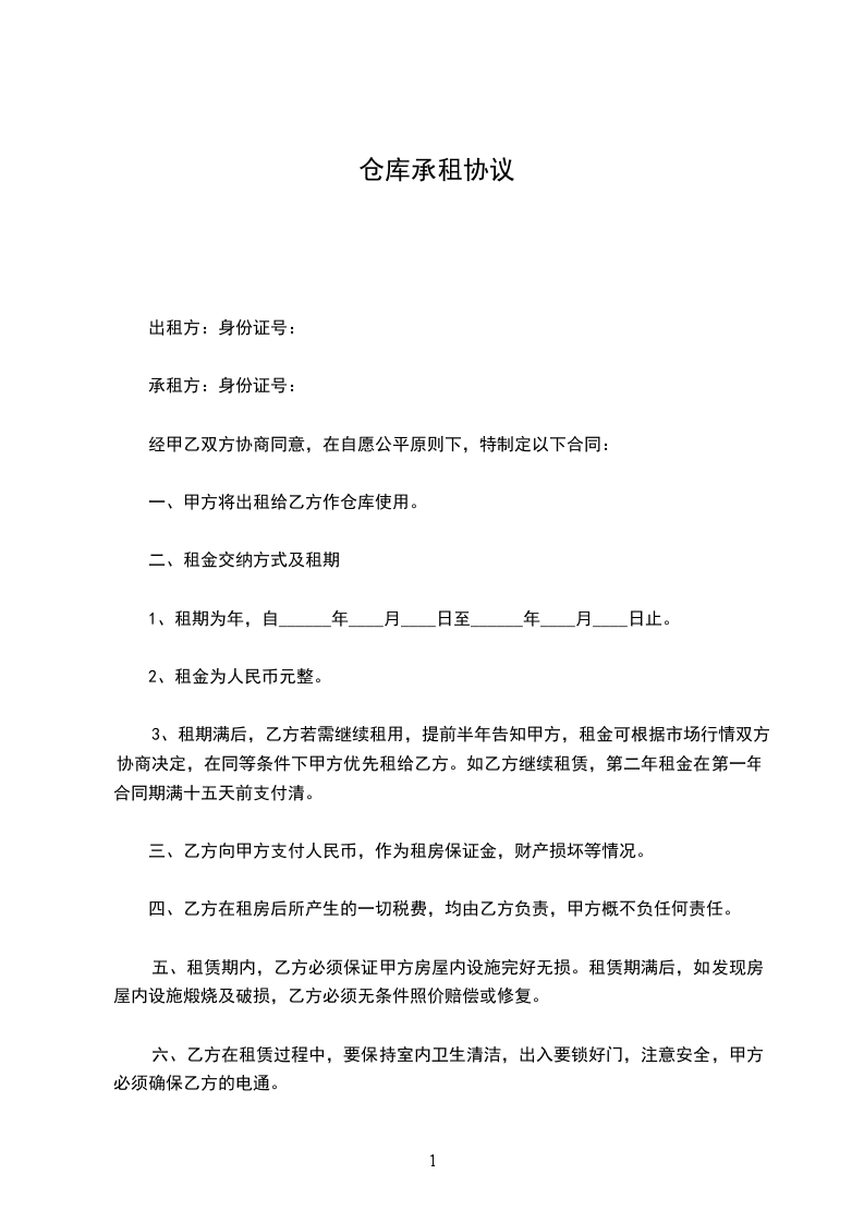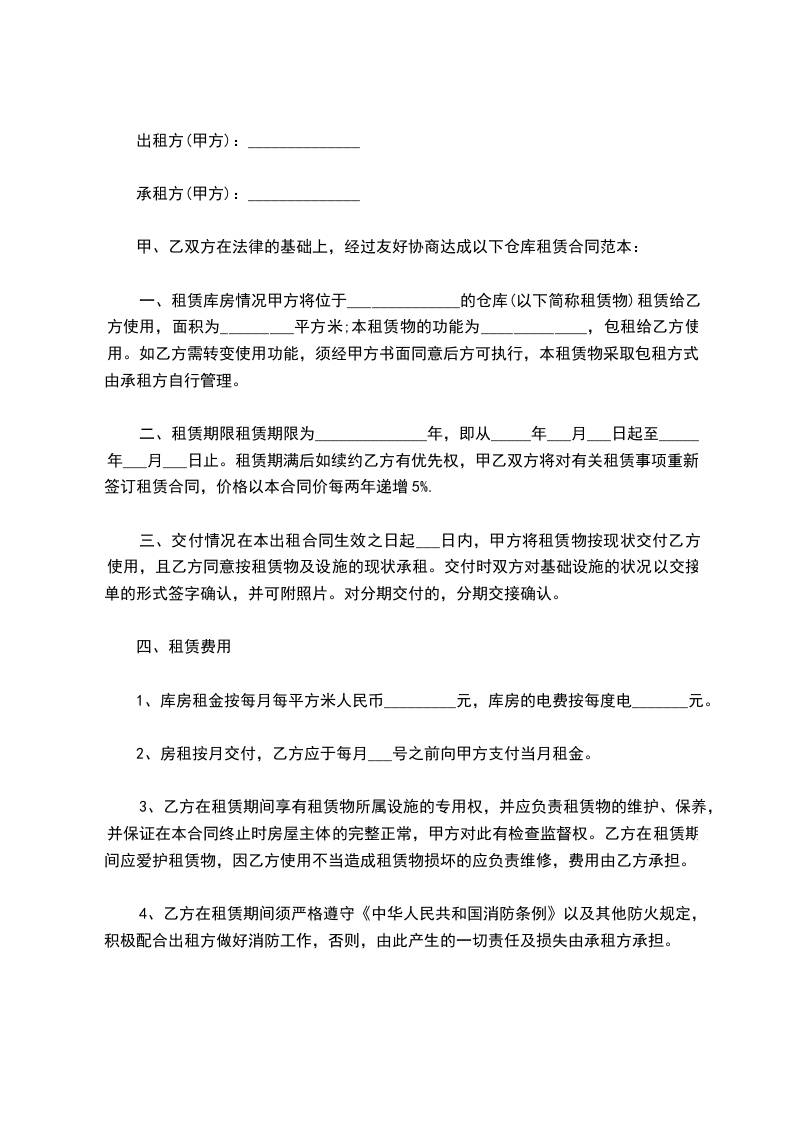 一、甲方将出租给乙方作仓库使用。