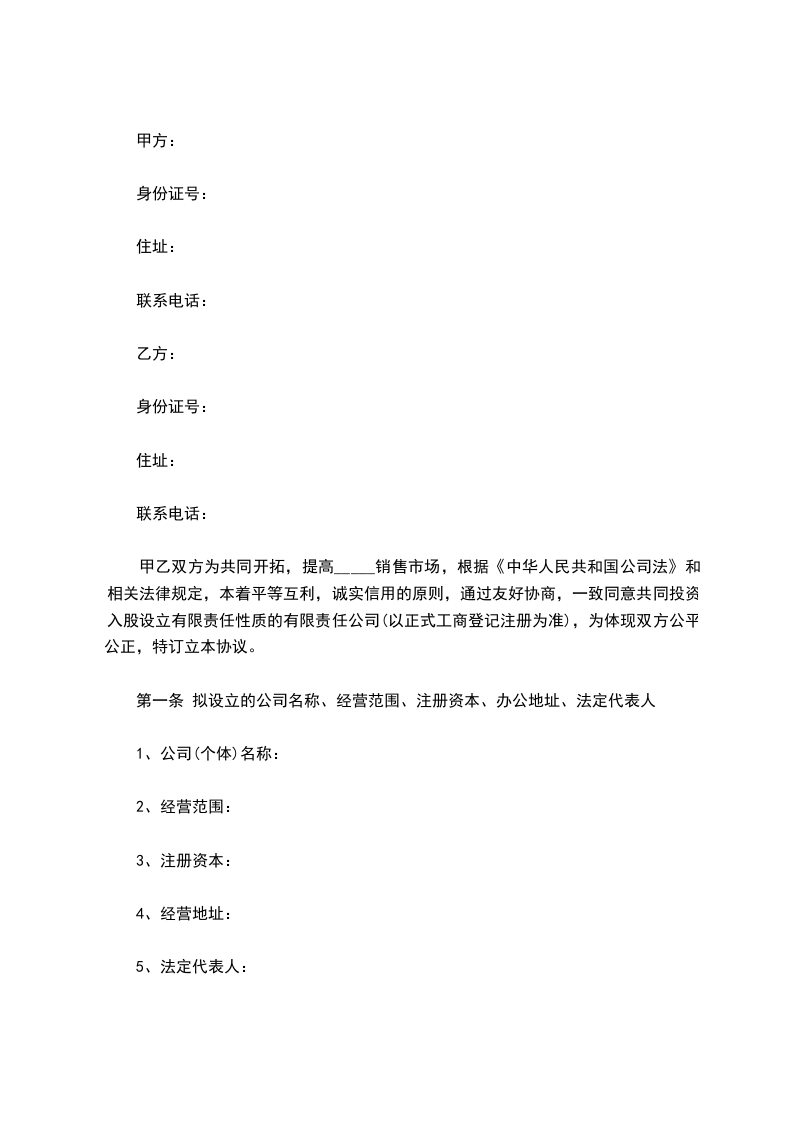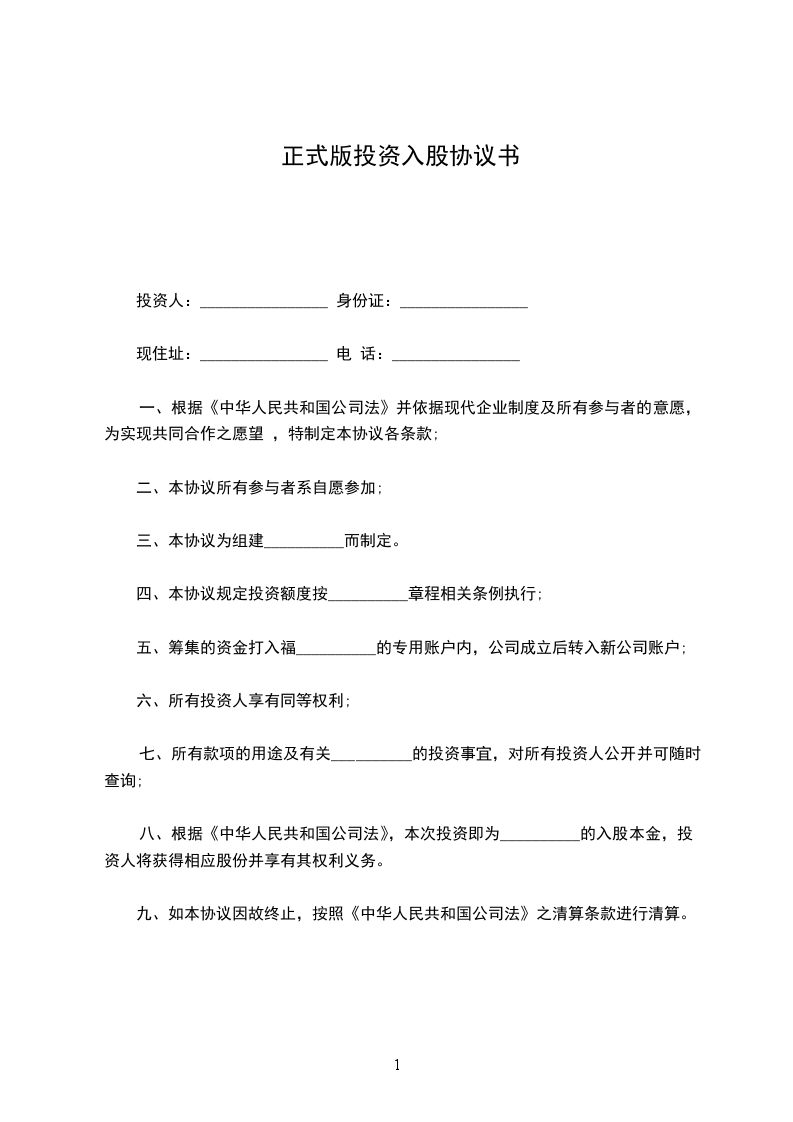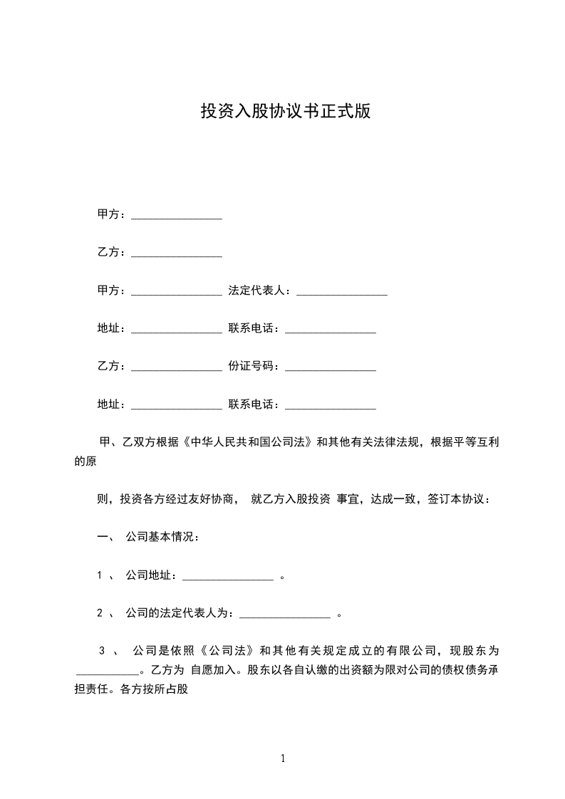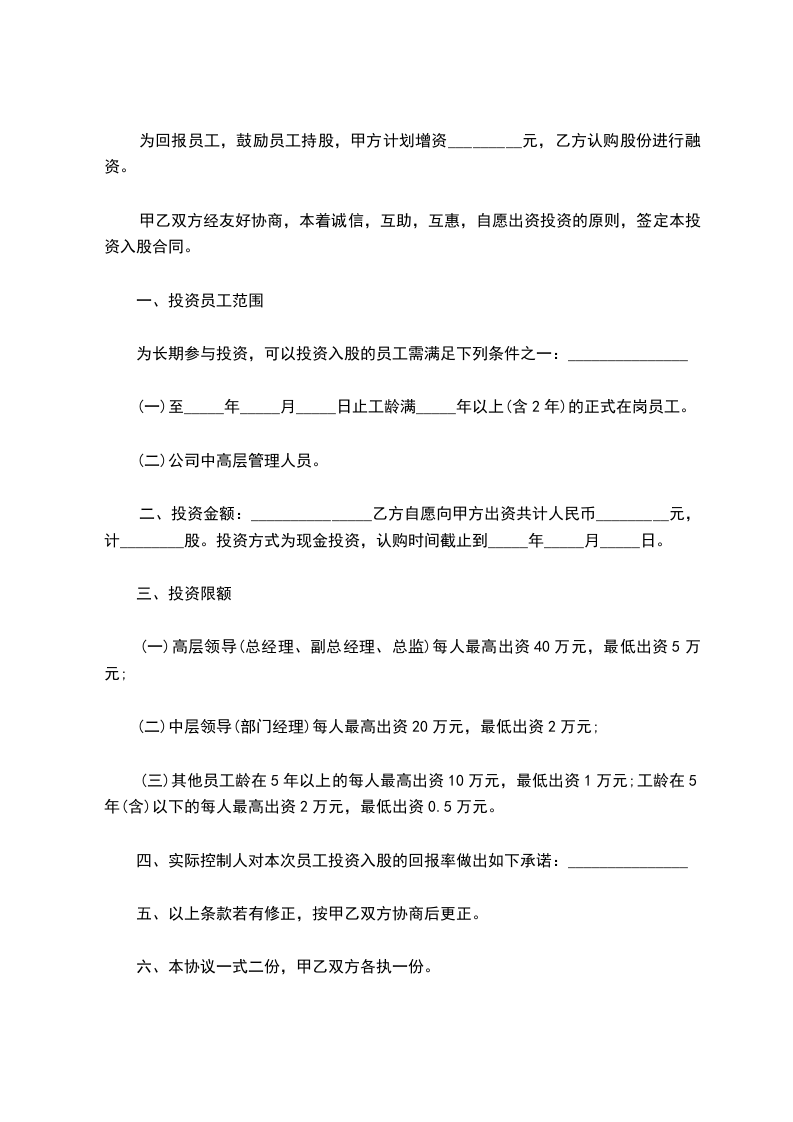 二、投资金额:_______________乙方自愿向甲方出资共计人民币_________元,计________股。投资方式为现金投资,认购时间截止到_____年_____月_____日。