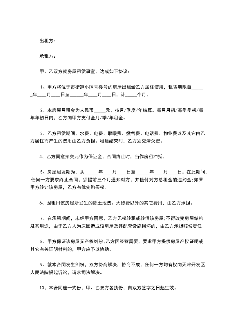 9、就本合同发生纠纷,双方协商解决,协商不成,任何一方均有权向天津开发区人民法院提起诉讼,请求司法解决。