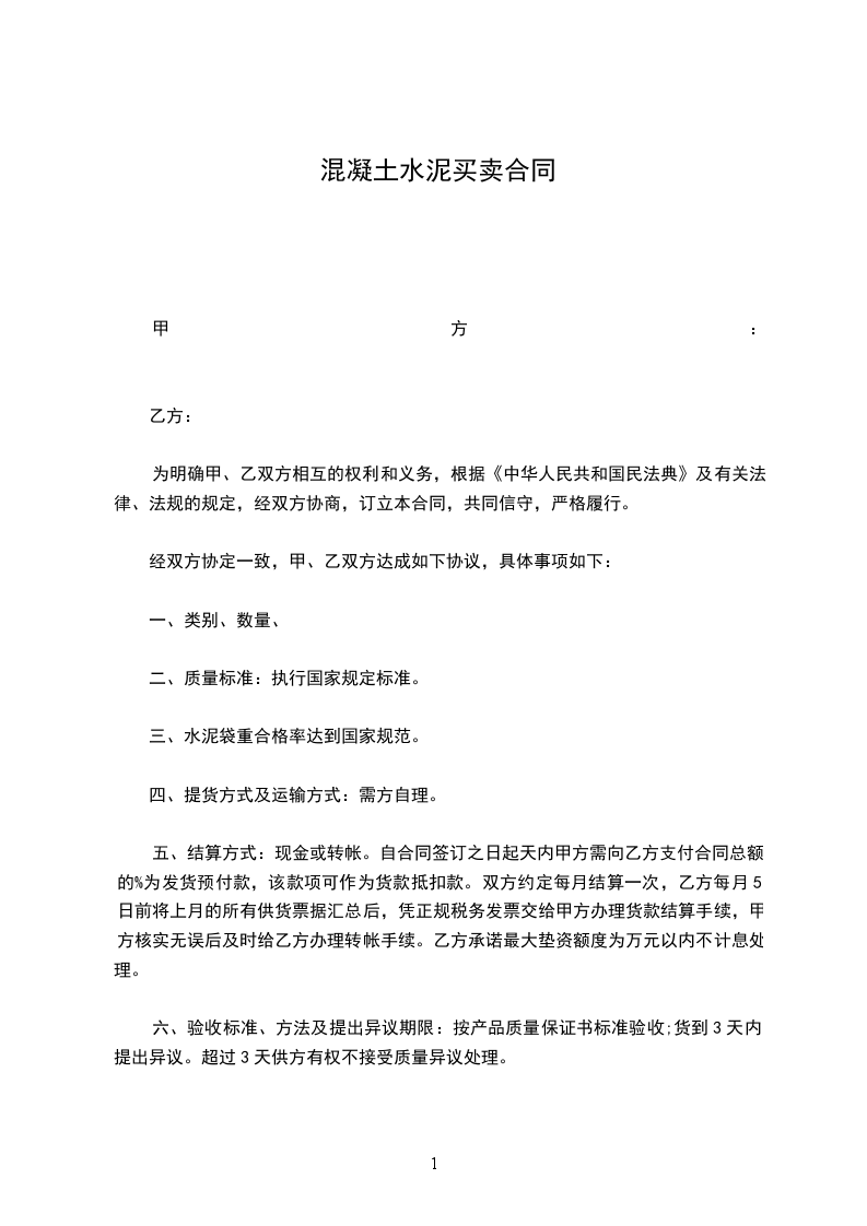 五、结算方式:现金或转帐。自合同签订之日起天内甲方需向乙方支付合同总额的_____%为发货预付款,该款项可作为货款抵扣款。双方约定每月结算一次,乙方每月5日前将上月的所有供货票据汇总后,凭正规税务发票交给甲方办理货款结算手续,甲方核实无误后及时给乙方办理转帐手续。乙方承诺最大垫资额度为万元以内不计息处理。