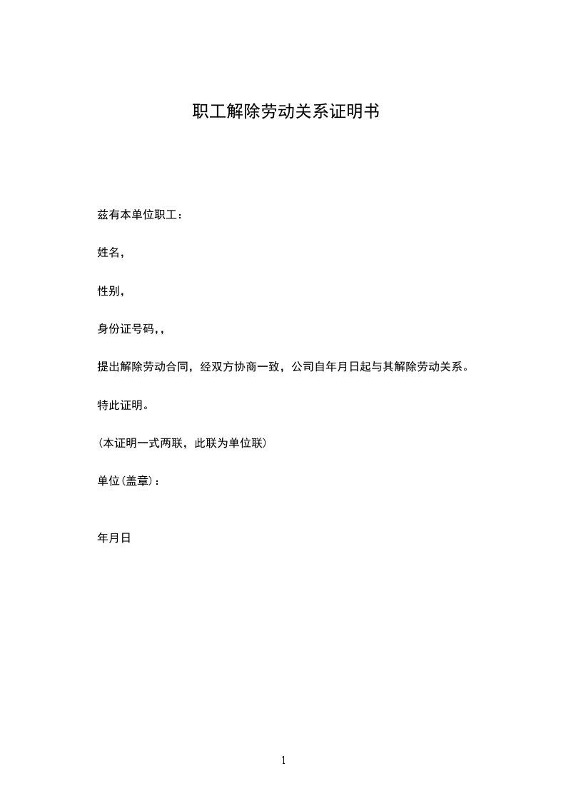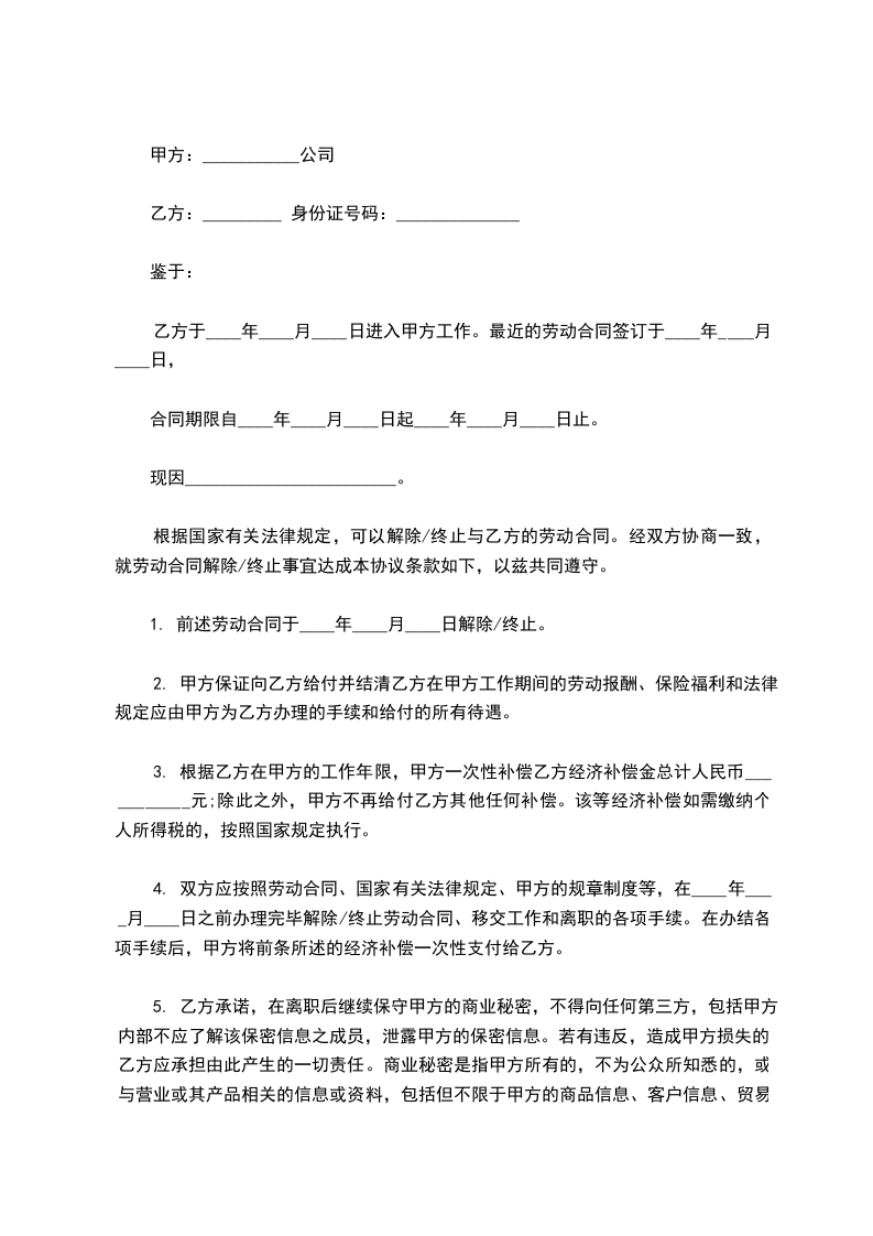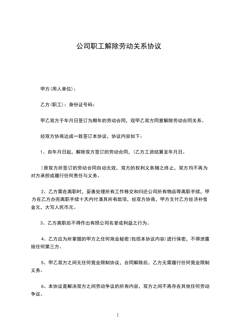 第一条甲乙双方同意解除20__年__月__日签订的《劳动合同》及其它相关协议。自协议解除之日起,甲乙双方彼此之间的权利、义务关系自行消灭。甲乙双方相互不再以任何形式追求对方的违约责任。