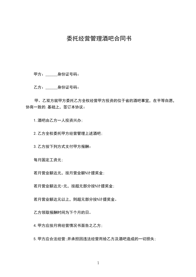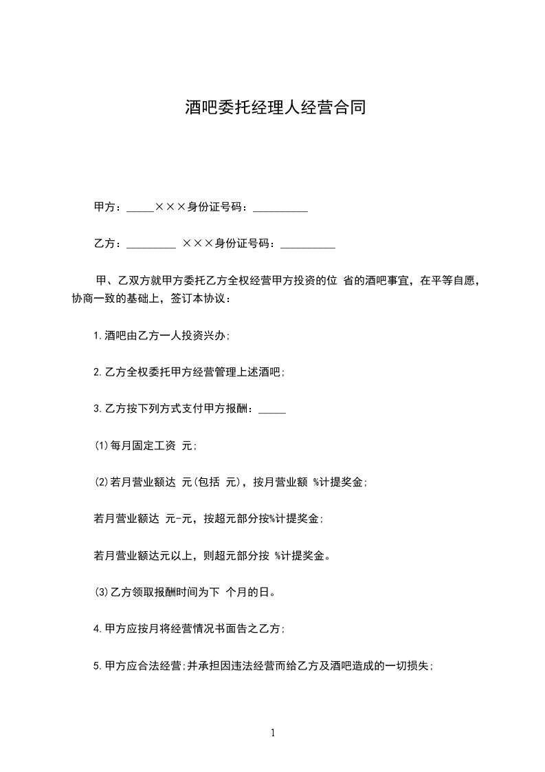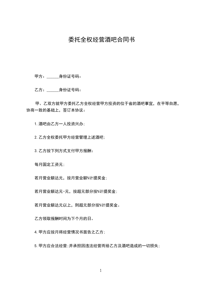 甲、乙双方就甲方委托乙方全权经营甲方投资的位于省的酒吧事宜,在平等自愿,协商一致的.基础上,签订本协议:
