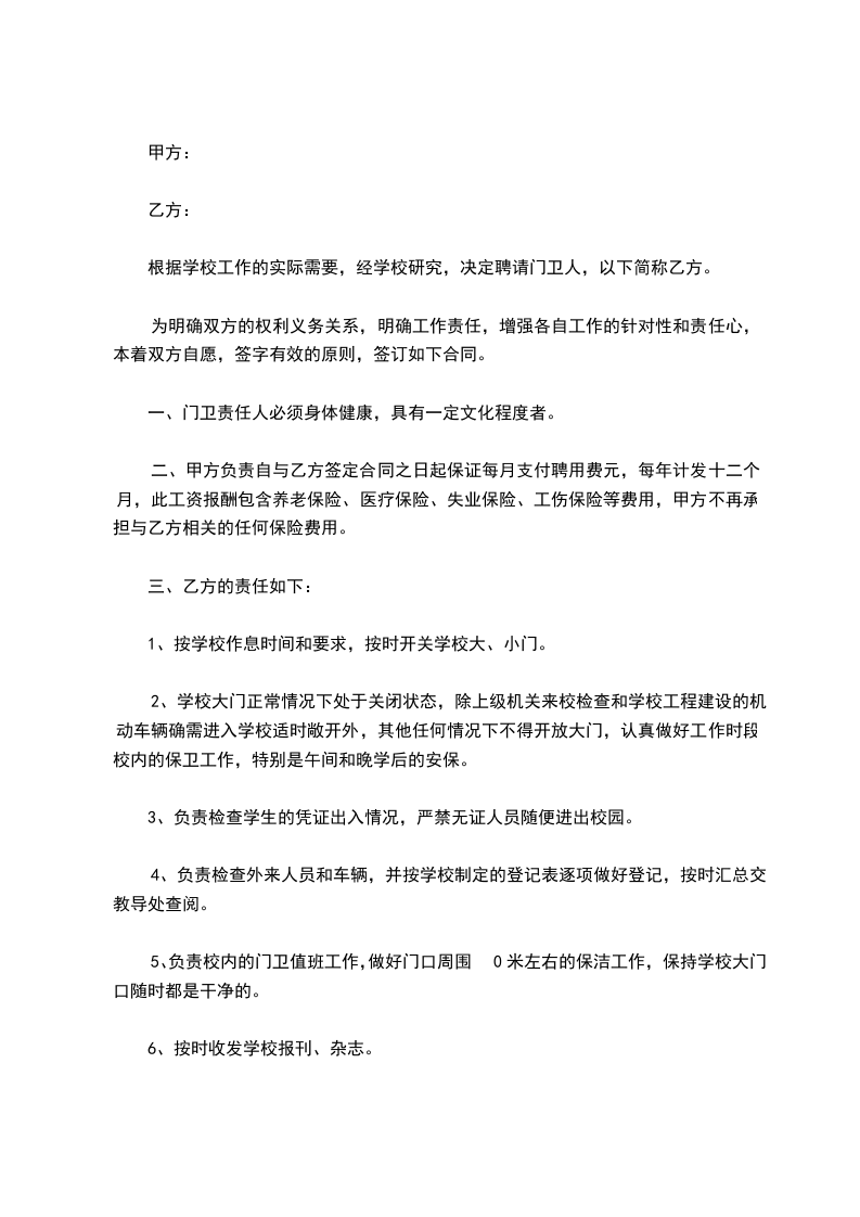 根据学校工作的实际需要,经学校研究,决定聘请门卫人,以下简称乙方。