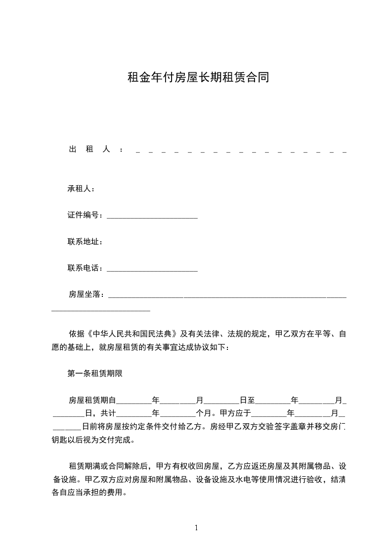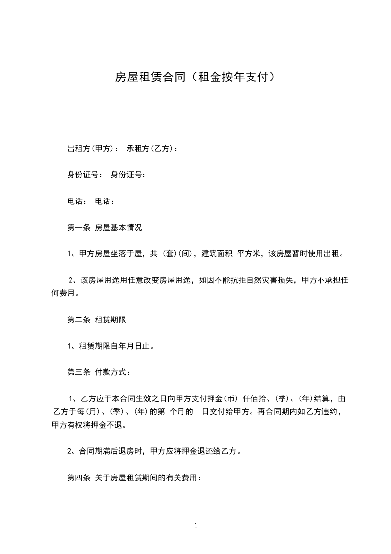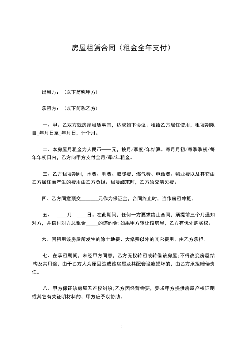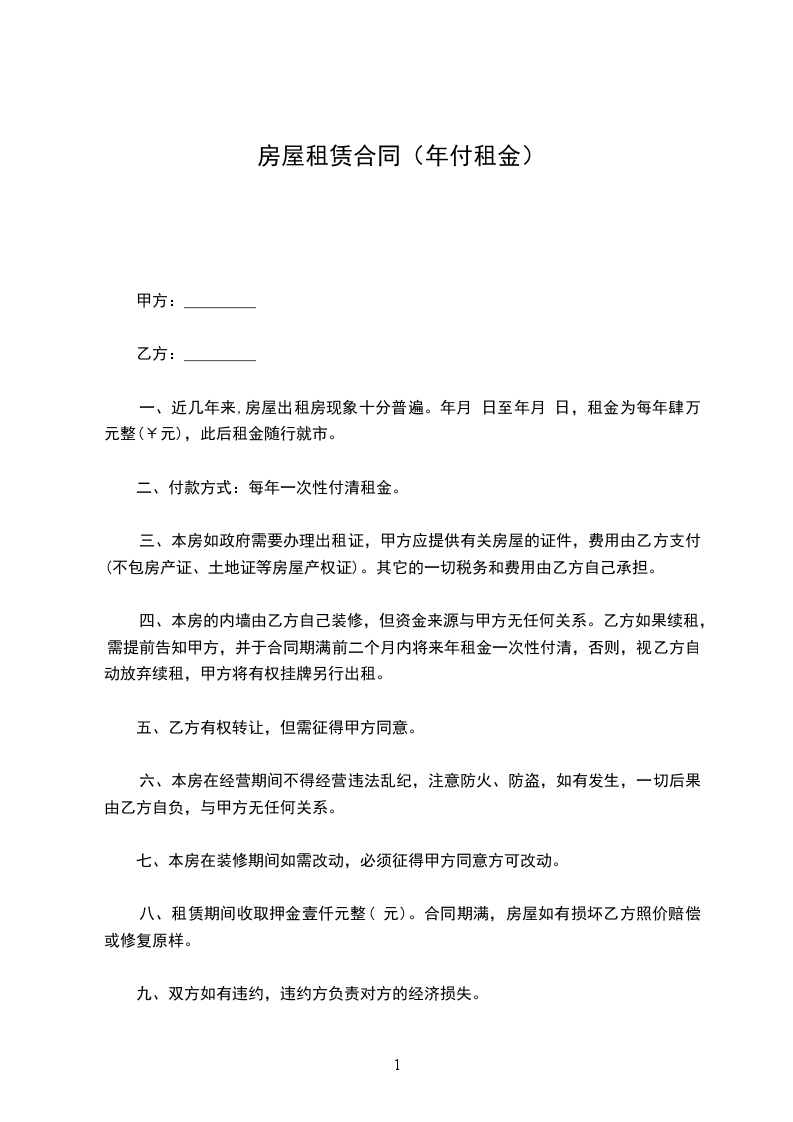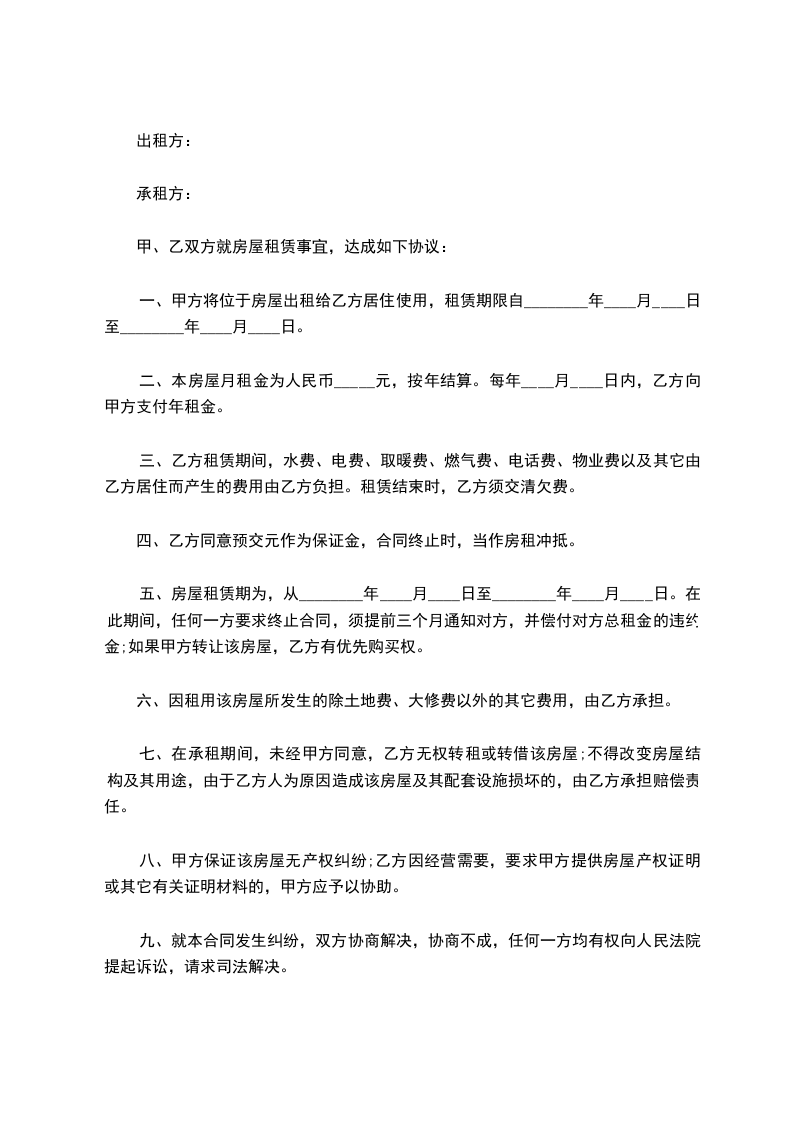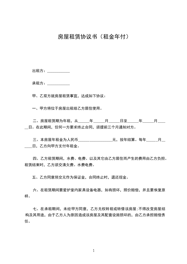 三、本房屋年租金为人民币__________________元,按年结算。每年______月______日,乙方向甲方支付年租金。