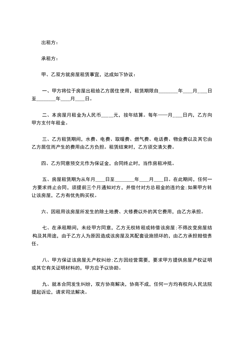 二、房屋租赁期为年租,从______年______月______日至______年______月______日。在此期间,任何一方要求终止合同,须提前三个月通知对方。