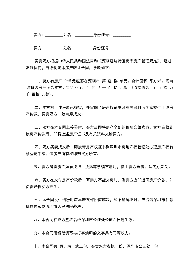 十、本合同共页,为一式三份,买卖双方各执一份,深圳市公证处一份,均具同等效力。
