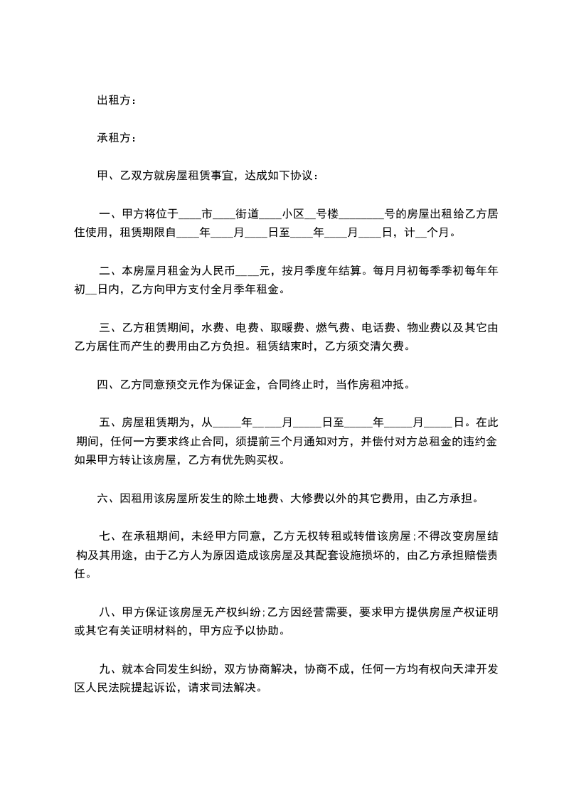 一、甲方将位于____市____街道____小区__号楼________号的房屋出租给乙方居住使用,租赁期限自____年____月____日至____年____月____日,计__个月。