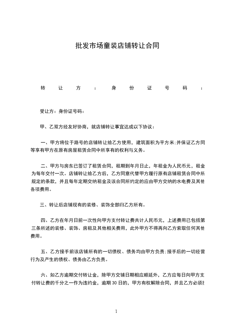 一、甲方将位于路号的店铺转让给乙方使用,建筑面积为_____平方米;并保证乙方同等享有甲方在原有房屋租赁合同中所享有的权利与义务。