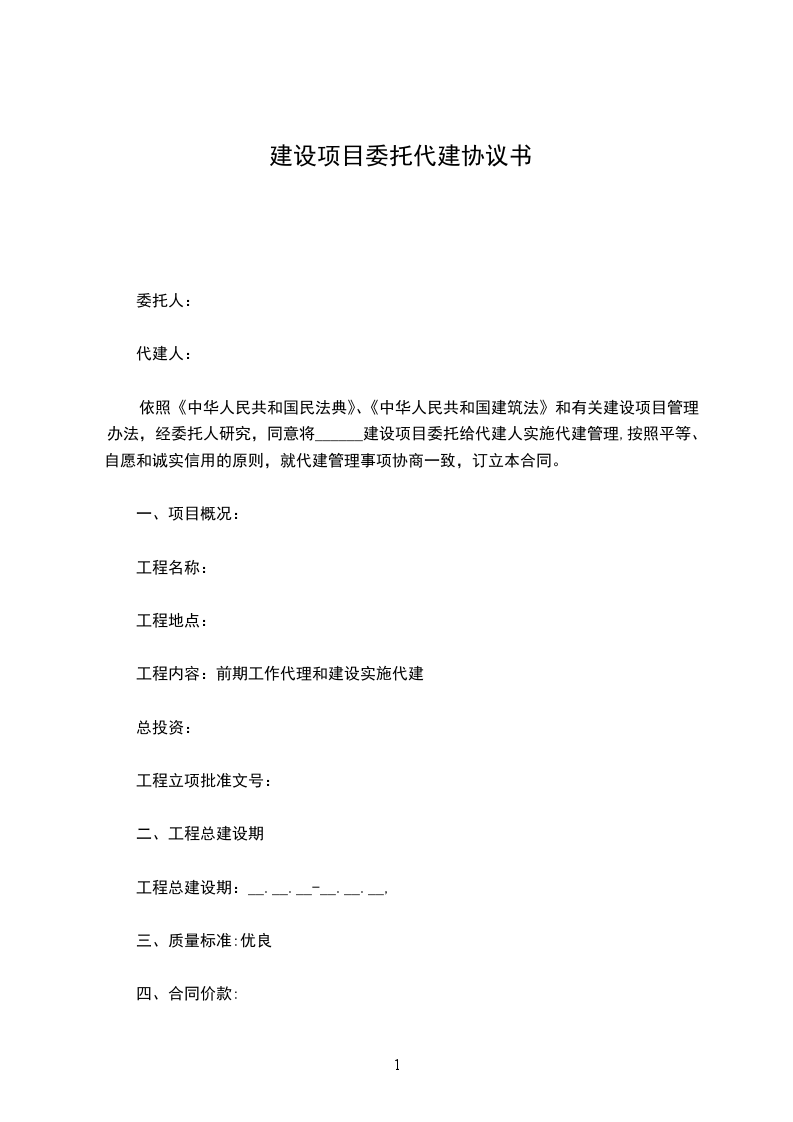 依照《中华人民共和国民法典》、《中华人民共和国建筑法》和有关建设项目管理办法,经委托人研究,同意将______建设项目委托给代建人实施代建管理,按照平等、自愿和诚实信用的原则,就代建管理事项协商一致,订立本合同。