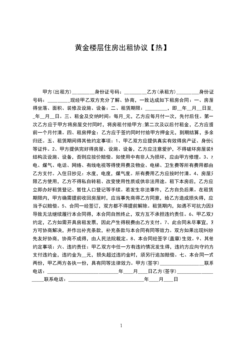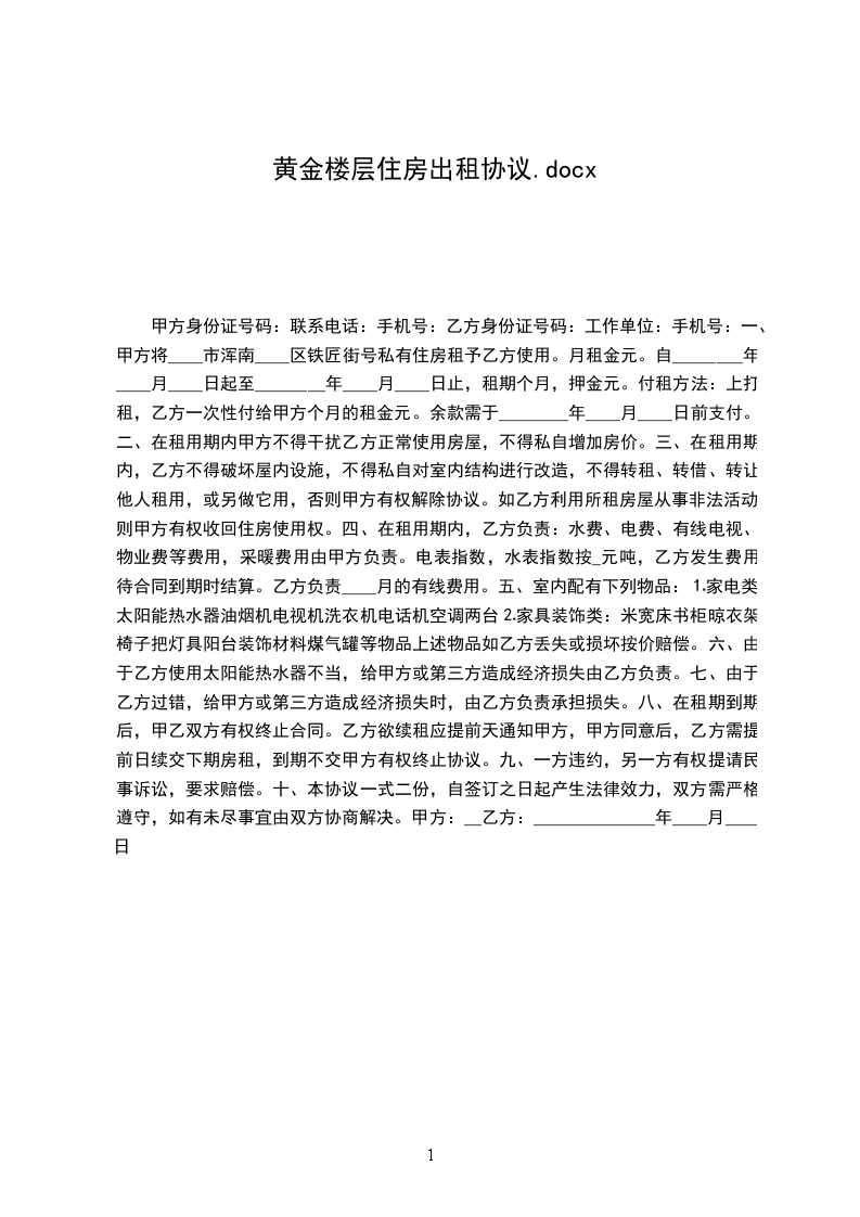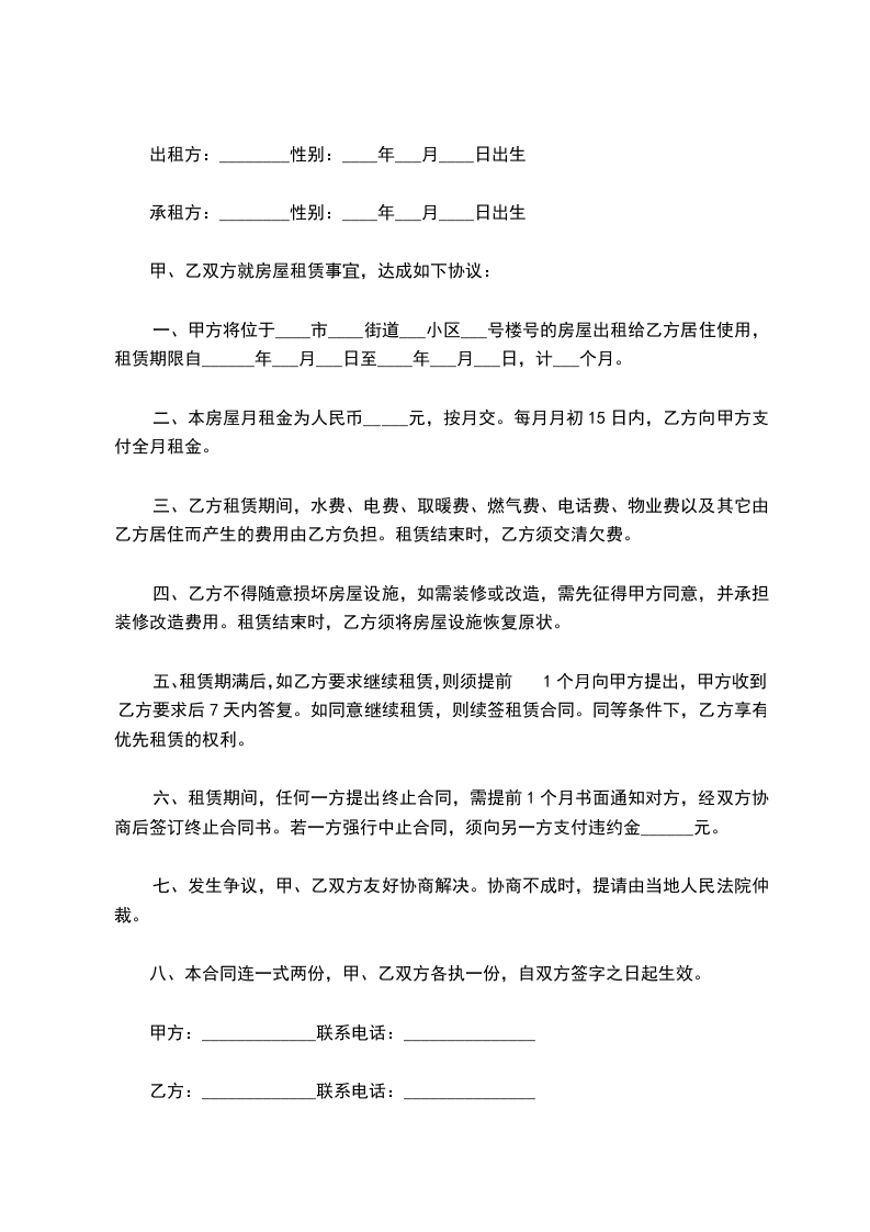 一、甲方将位于____市____街道___小区___号楼号的房屋出租给乙方居住使用,租赁期限自______年___月___日至____年___月___日,计___个月。