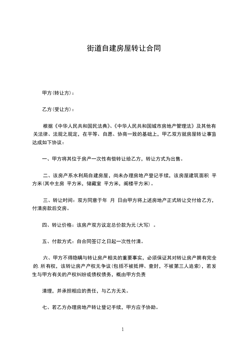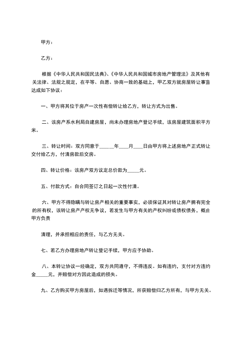 根据《中华人民共和国民法典》、《中华人民共和国城市房地产管理法》及其他有关法律、法规之规定,在平等、自愿、协商一致的基础上,甲乙双方就房屋转让事宜达成如下协议: