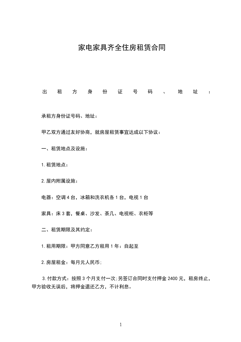一、甲方将位于__________地方的房屋出租给乙方居住使用,室内主要家具有:________,______,_______。