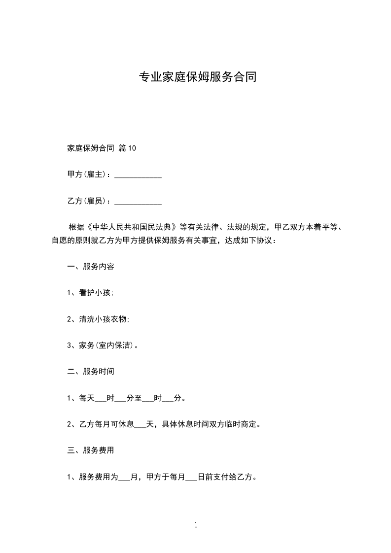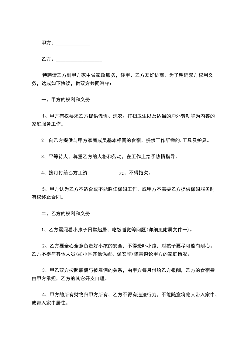 根据《中华人民共和国民法典》等有关法律、法规的规定,甲乙双方本着平等、自愿的原则就乙方为甲方提供保姆服务有关事宜,达成如下协议:
