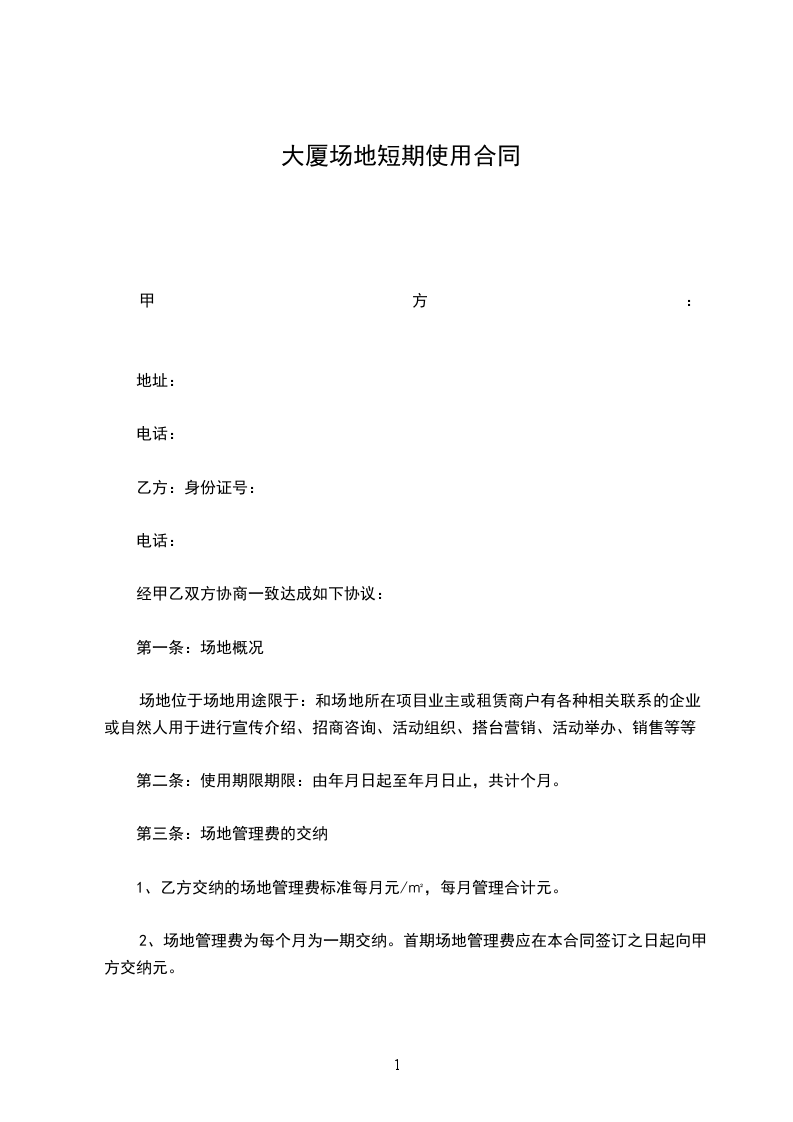 2、场地管理费为每个月为一期交纳。首期场地管理费应在本合同签订之日起向甲方交纳元。
