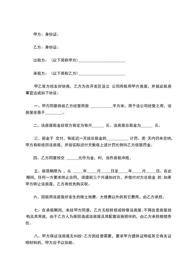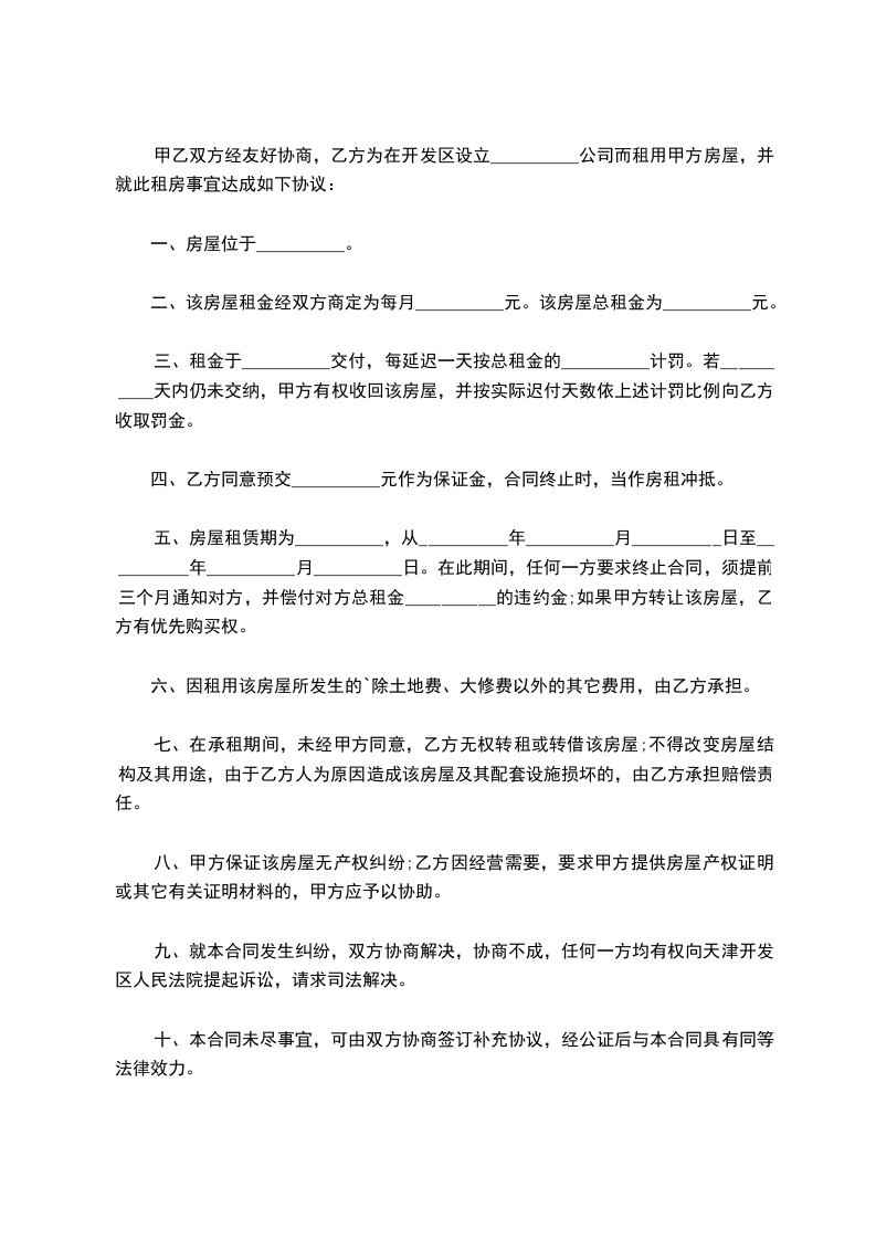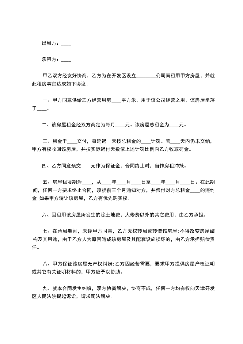 甲乙双方经友好协商,乙方为在开发区设立公司而租用甲方房屋,并就此租房事宜达成如下协议: